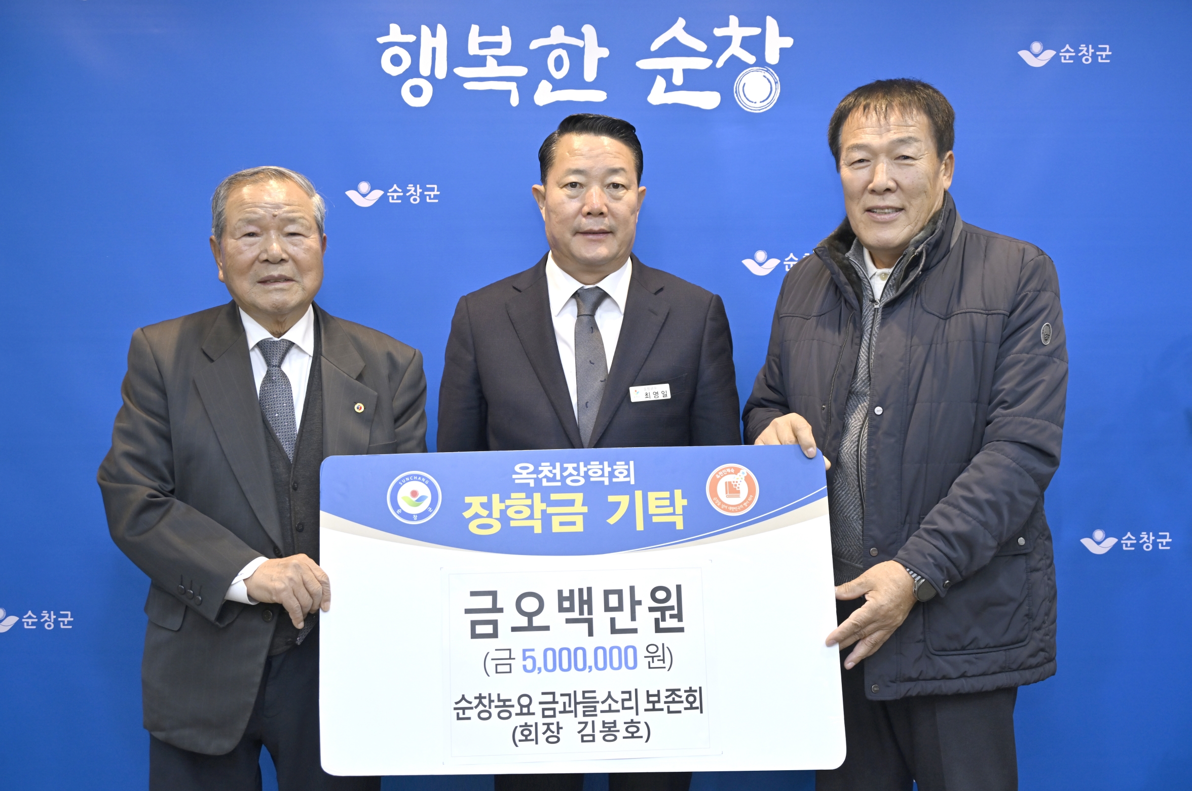 - 순창군은 최근 순창농요 금과들소리 보존회(회장 김봉호)가 (재)순창군옥천장학회에 장학금 500만원을 기탁하며 지역 인재 육성에 힘을 보탰다고 밝혔다.