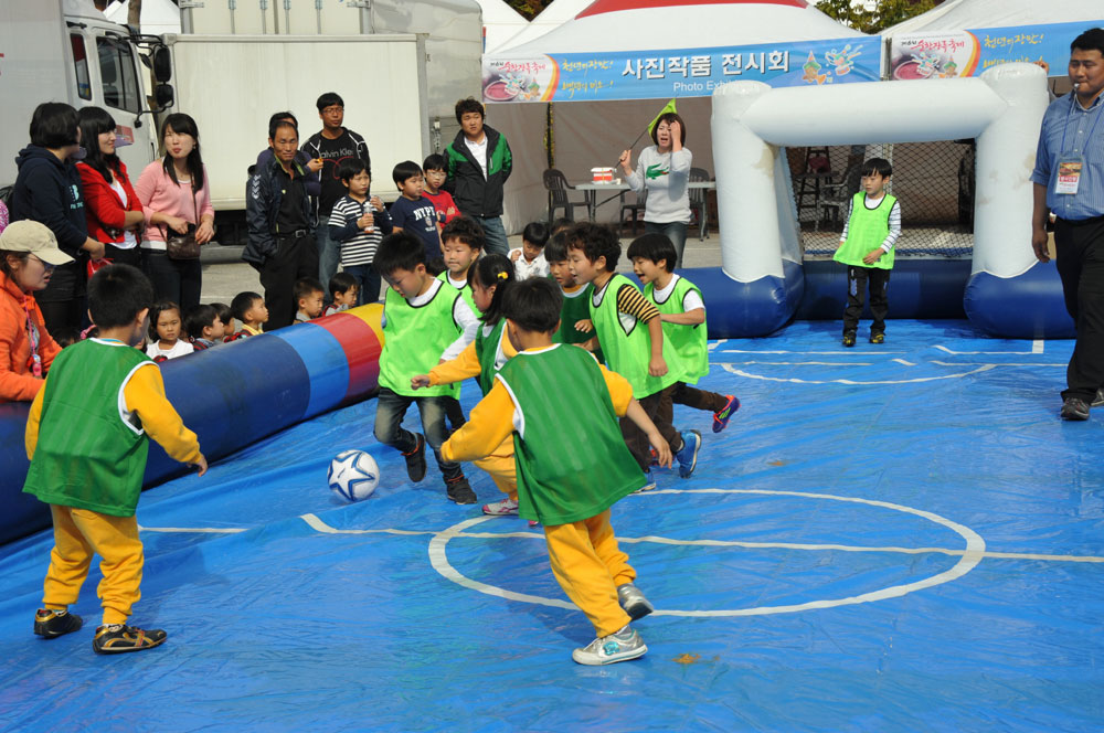 - 6명이 한 팀이 된 어린이집 아이들이 공기가 주입된 작은 운동장에서 미니축구경기를 하고 있다. -2011. 11. 4-