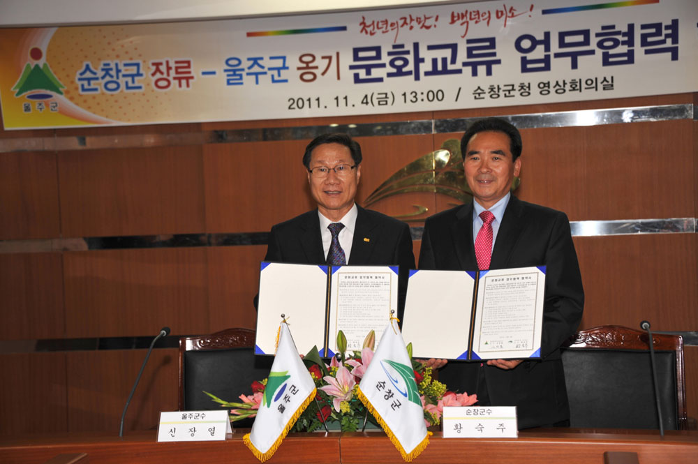 - 4일 군청 영상회의실에서 황숙주 순창군수와 신장열 울주군수, 관계자 등 20여명이 참석한 가운데 순창 장류와 울주 옹기 문화교류 협약식을 가졌다. -2011. 11. 4-