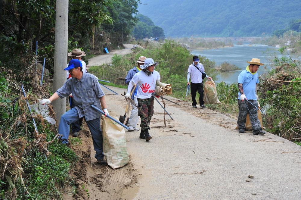 - 순창군에 지난 9일 내린 집중호우(최고 211mm)로 제방유실, 주택 및 농경지 침수, 양어장 침수 등 수십억원의 재산피해가 발생한 가운데 순창군 공무원 및 자율방재단원이 수해현장으로 달려가 복구활동을 펼쳤다. 순창군청 직원 30명과 동계면 자율방재단 40여명 등 70여명은 16일 동계면 섬진강변의 쓰레기수거 작업을 펼치며 구슬땀을 흘렸다. -2011. 8. 16-