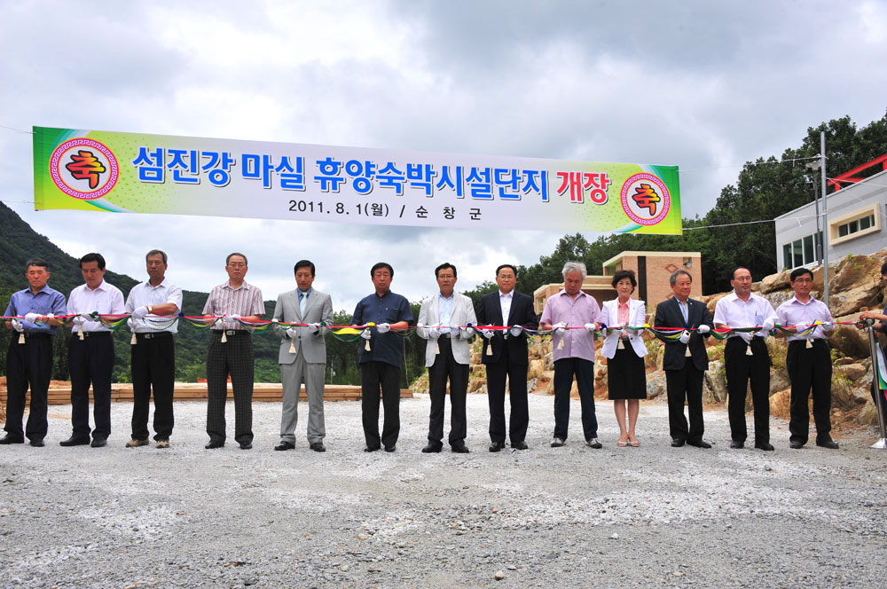 - 순창군 장군목 섬진강 자락에 위치한 ‘섬진강 마실휴양숙박단지’가 8월 1일 신현승 군수 권한대행을 비롯해 군의원, 실과소원단장 등 30여명이 참여한 가운데 개장식을 가졌다. 이날 테이프 커팅을 시작으로 관리동, 취사장, 숙박동 등 시설물을 관람했다. 섬진강마실휴양숙박단지는 순창군 적성면 석산리에 3동의 팬션과 18개의 야영장, 부대시설 등을 갖추고 있다. 현 성수기 이용요금은 팬션 49㎡(14평형 8명 기준)형 10만원, 61㎡(18평형 10명 기준)형 12만원이며, 야영장은 1인기준 어른 2000원, 중․고생 1500원, 어린이 1000원이다. 문의 문화관광과 관광계(☎063-650-1648) -2011. 8. 1-