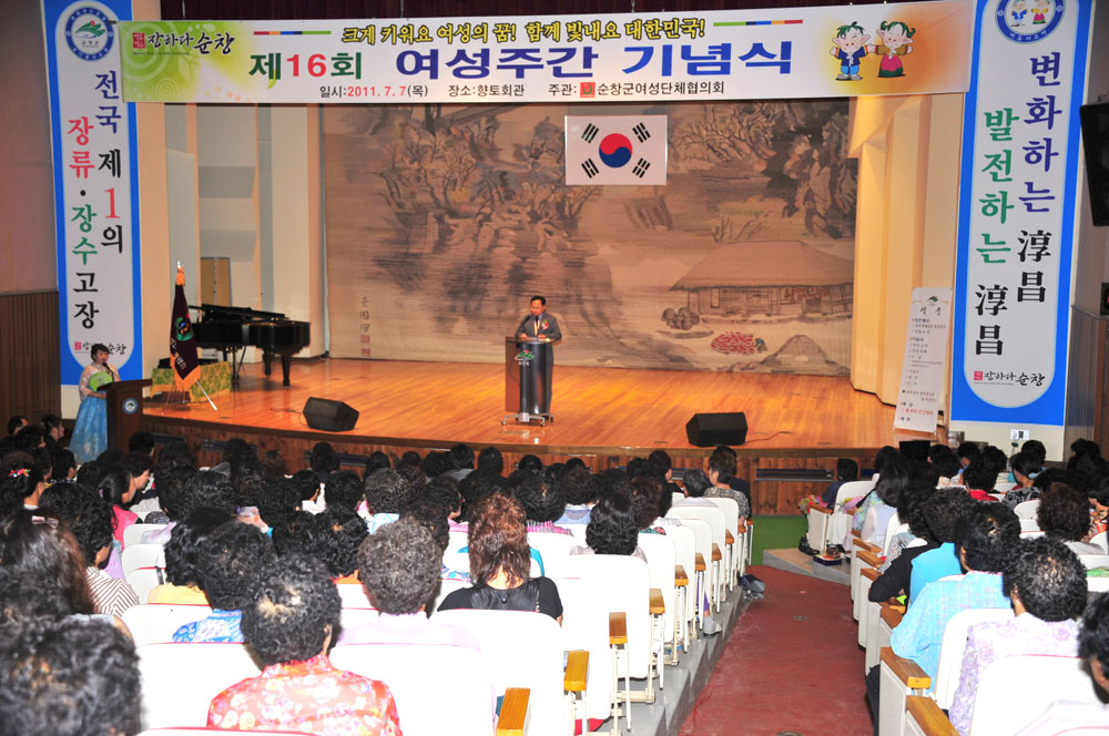 - 순창군 여성단체협의회(회장 이남숙)는 7일 군민복지회관 향토관에서 여성단체 및 읍면 여성지도자, 다문화가족 등 600여명이 참석한 가운데제16회 여성주간 기념행사를 가졌다. 이날 다문화가족과 여성합창단의 문화공연이 있었으며, 영남대 의대교수인 신상대 강사의 “행복한 건강열쇠” 특강이 펼쳐져 참석자들의 많은 관심을 모았다. -2011. 7. 7-