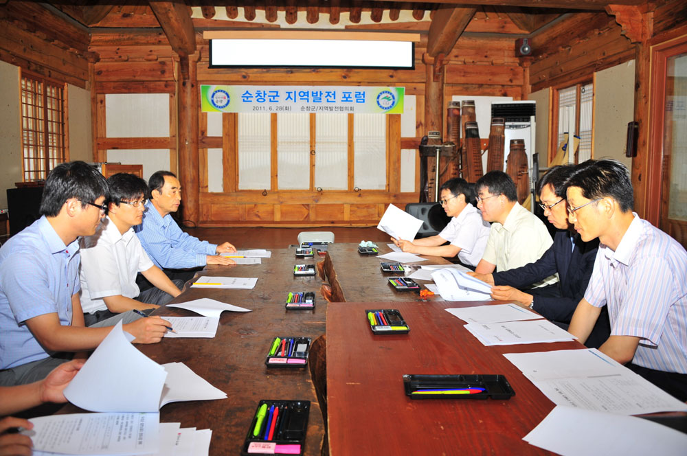 - 28일 전주한옥생활체험관에서 전북대 안득수 교수를 비롯한 전문가 5명과 순창군 지역발전협의회 신동화 의장과 공무원 등 20여명이 참석한 가운데 지역발전 방향 모색을 위한 ‘순창군 지역발전 포럼’을 가졌다. 이번 토론회는 전문가와 공무원이 함께 지역 미래에 대한 토론으로 발전 방향을 모색하고, 지역발전 주체별 참여의식 확산과 학습활동을 통한 역량을 강화하기 위해 추진됐다. -2011. 6. 28-