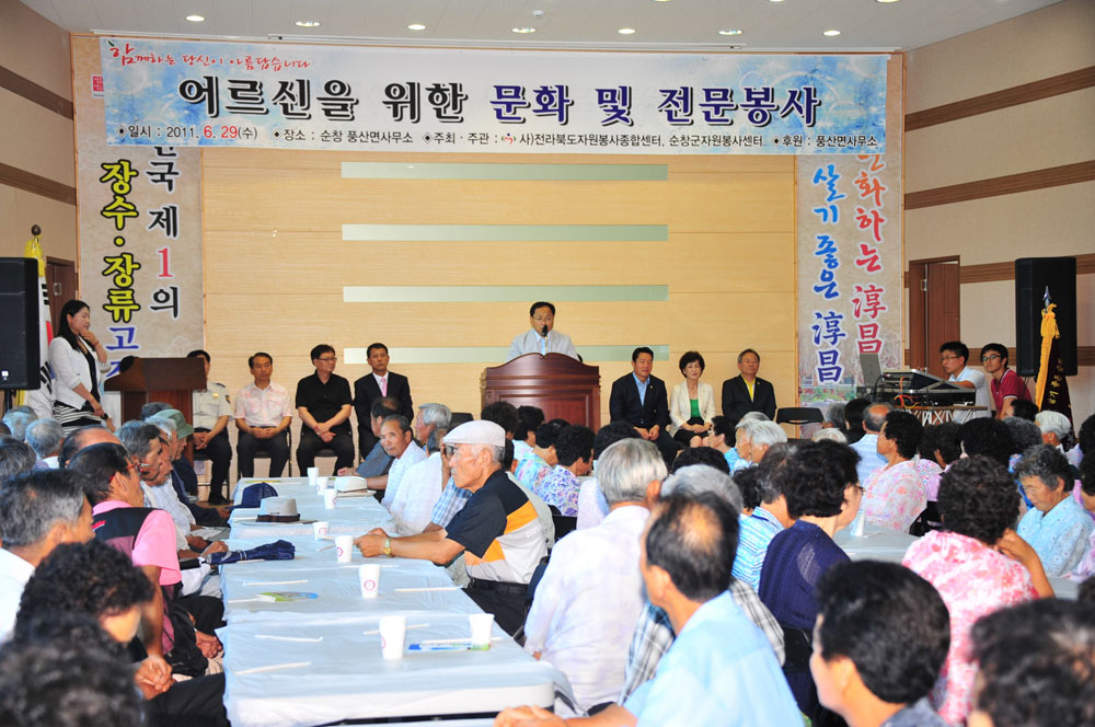 - 29일은 풍산면주민자치센터에서 풍산면 어르신 300명을 모신 가운데 (사)전라북도자원봉사종합센터(이사장 김기원)가 주최하고 순창군자원봉사종합센터(소장 김영주)가 주관한 전문봉사단의 봉사활동을 펼쳤으며, 전문봉사단의 봉사활동이 있었다. 이날 어르신들에게는 이동급식차량을 통해 다과와 점심을 대접하며 문화공연과 함께 어르신들의 노래자랑이 있었고, 서금요법, 발맛사지, 이․미용봉사, 쑥뜸, 이혈 등 전문봉사활동을 펼쳐 높은 호응을 얻었다. -2011. 6. 29-