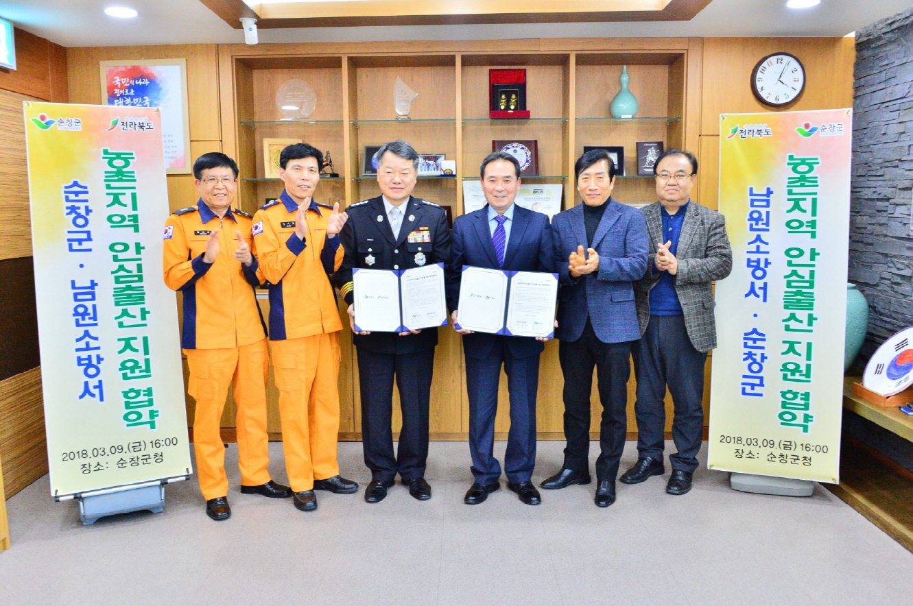 - 순창군과 남원소방서가 순창지역 산모들의 응급 출산을 지원하기 위해 뜻을 모았다. 군은 최근 군 영상회의실과 남원소방서와 농촌지역 안심출산지원을 위한 업무협약을 체결했다고 밝혔다.이번 업무 119 안심콜 시스템 운영과 긴급 출산 시 119구급차를 쉽고 빠르게 이용할 수 있는 내용을 주요 골자로 한다. 산부인과와 분만시설이 없는 순창군에서는 꼭 필요한 사업으로 기대를 모으고 있다.이번 협약 체결에 따라 순창군 보건의료원은 남원소방서와 지역 임신부 정보를 공유하고 읍면 이장단 회의를 통해 제도의 홍보에 본격 나설 계획이다. 남원소방서는 119안심콜 서비스에 임신부를 등록 관리하고 임신부 출산징후 신고 접수 시 긴급 출동해 산모를 안전하게 이송하는 역할을 담당한다. 현재 순창군보건의료원에는 142명의 임산부가 등록돼 있다. 관련해서 9일 업무협약식에는 황숙주 군수와 조용주남원소방서장 등 양측 관계자 10여명이 참석해 성공적 업무협약을 통한 안전한 농촌지역 출산환경을 만들기로 합의했다. 현재 순창군보건의료원에는 142명의 임산부가 등록돼 있다. 황숙주 군수는 “이번 업무협약은 출산 시설이 없는 순창지역 현실을 감안하면 매우 의미 있는 사업이다” 면서 “119 안심콜 센터 운영이 꼭 성공적으로 운영되길 바란다”고 말했다. 한편 순창군과 남원소방서는 순창군거주 거동불편어르신 342명에 대한 데이터를 등록해 놓고 유사시 긴밀하게 대응할 수 있는 협조체계를 구축해 성공적으로 운영 중이다.