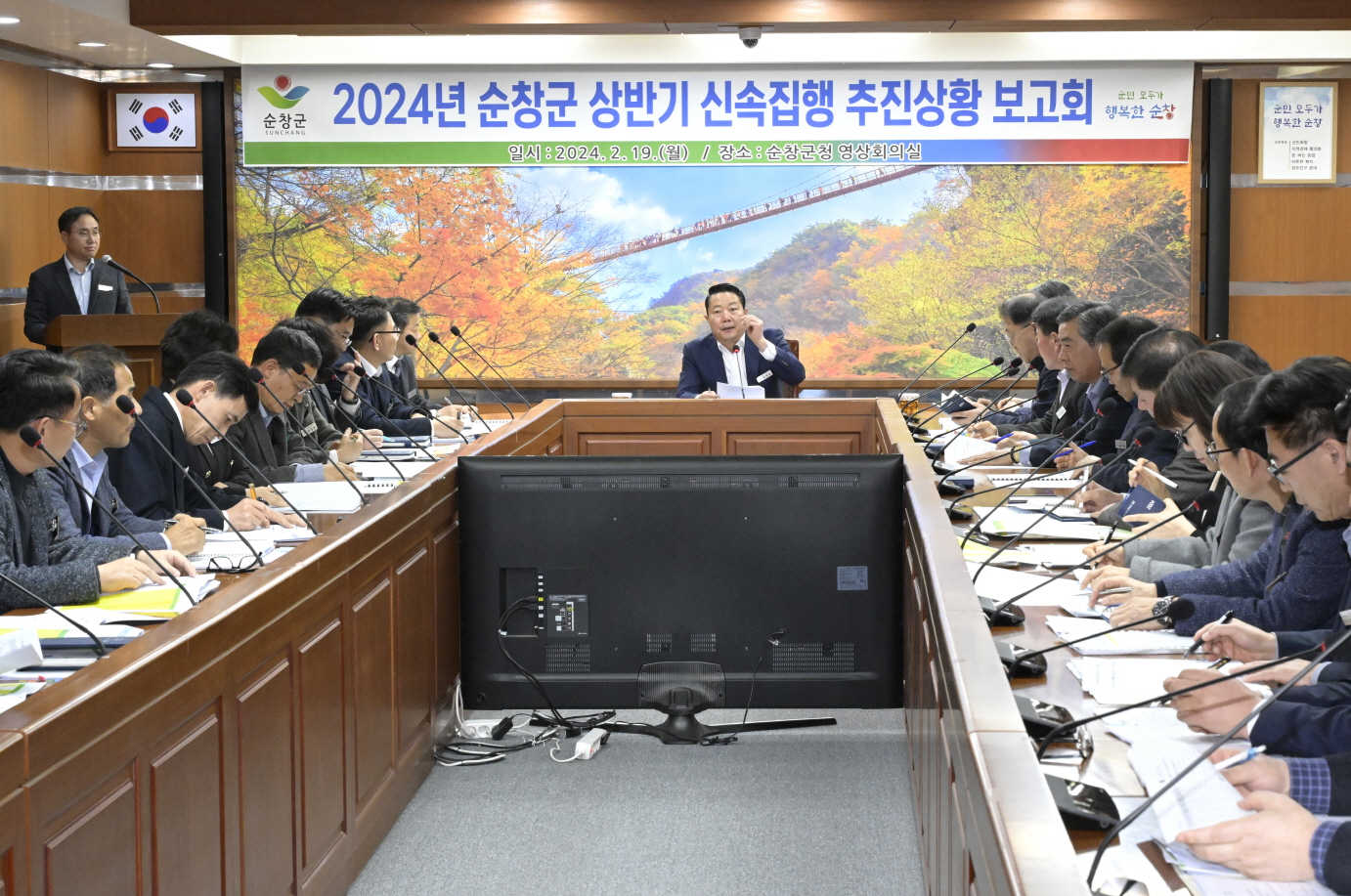 - 19일 고물가·고금리 여파로 위축된 지역경제 활성화를 위해 최영일 군수 주재하에 전 부서장이 참석한 ‘2024년도 상반기 신속집행 추진상황 보고회’를 가졌다. 이번 보고회를 통해 신속집행 대상액 3,567억 원 중 58.9%에 해당하는 2,101억 원을 상반기 목표액으로 자체 설정하고, 부서별 주요 사업 추진계획을 공유하는 한편, 사업별 문제점 파악과 전략적 해결방안 등에 대해 논의했다. -2024년 2월 19일-
