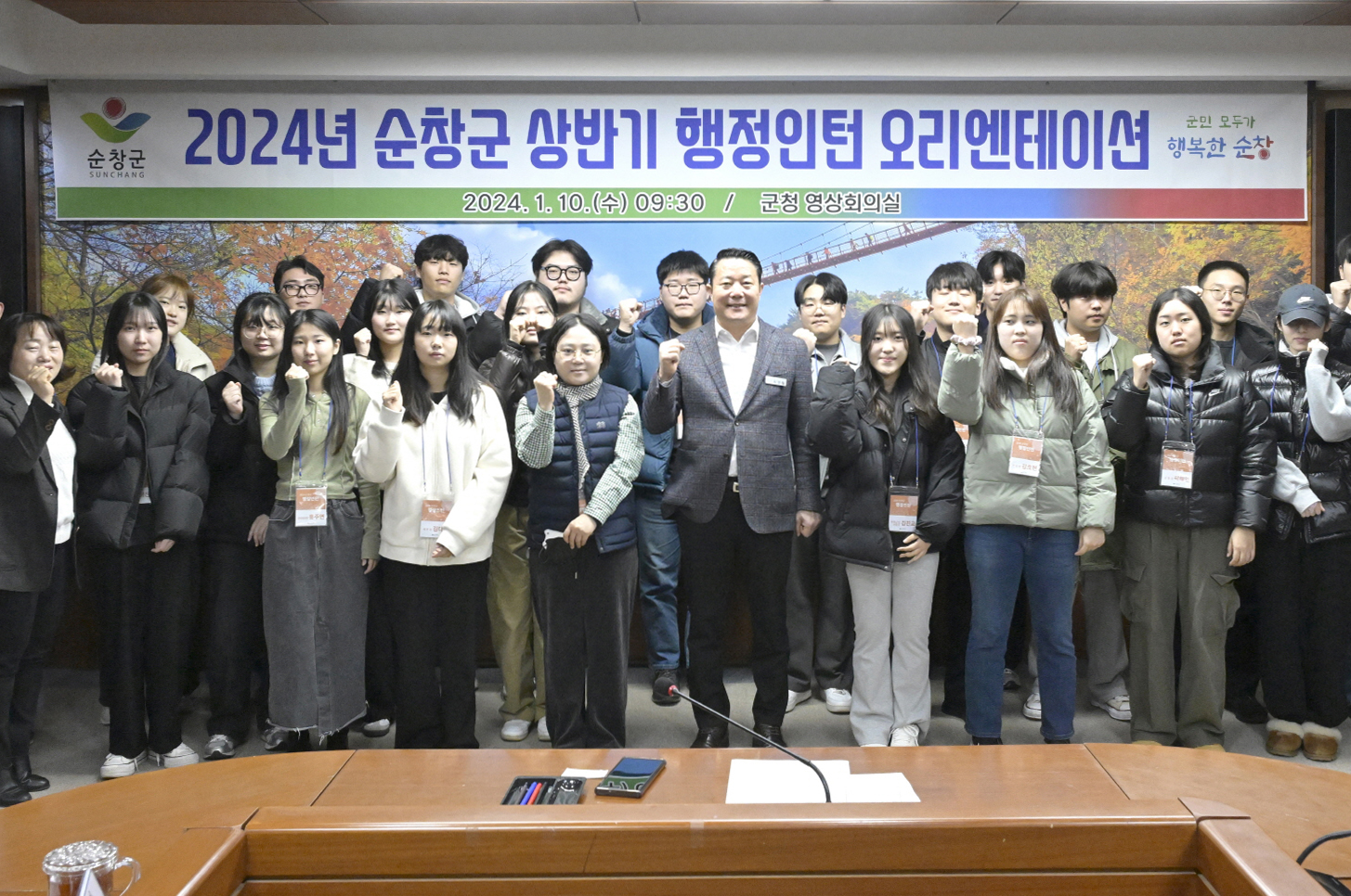 - 10일 군청 2층 영상회의실에서 2024년 상반기 행정인턴 사업 오리엔테이션을 개최했다. 올해부터는 행정인턴사업 참여 대상을 대학생에서 미취업 청년까지 확장했으며, 쌍치, 동계, 복흥, 구림면처럼 원거리 학생들도 참여가 가능하도록 우선 선발 범위도 확대했다. -2024년 1월 10일-