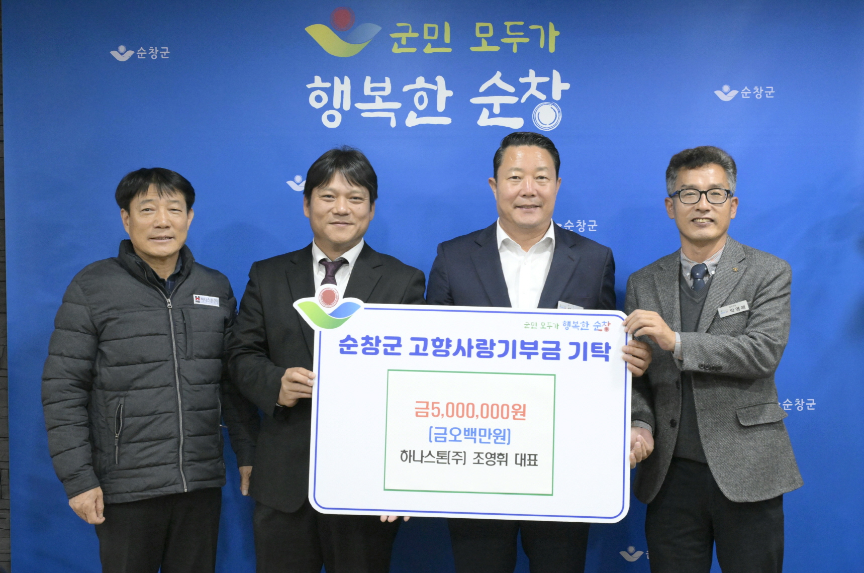 - 순창군 팔덕면에서 하나스톤 주식회사를 운영 중인 조영휘 대표가 순창군 고향사랑기부 최고액 기부자에 이름을 올렸다. 28일 하나스톤(주) 조영휘 대표가 순창군청을 직접 방문해 필요한 곳에 써달라며 고향사랑기부금 최고액인 500만원을 기탁했다. 하나스톤 주식회사는 기초석 등 콘크리트 제품을 생산하는 전문기업으로 지난 2017년 11월 순창군 팔덕면에 공장을 준공하여 사업을 시작했으며, 사업을 꾸려나가며 지난 2020년부터 꾸준히 옥천장학회에 장학금을 기탁하는 등 인재 양성에도 이바지하고 있어 지역사회에 귀감이 되고 있다. -2023년 11월 28일-