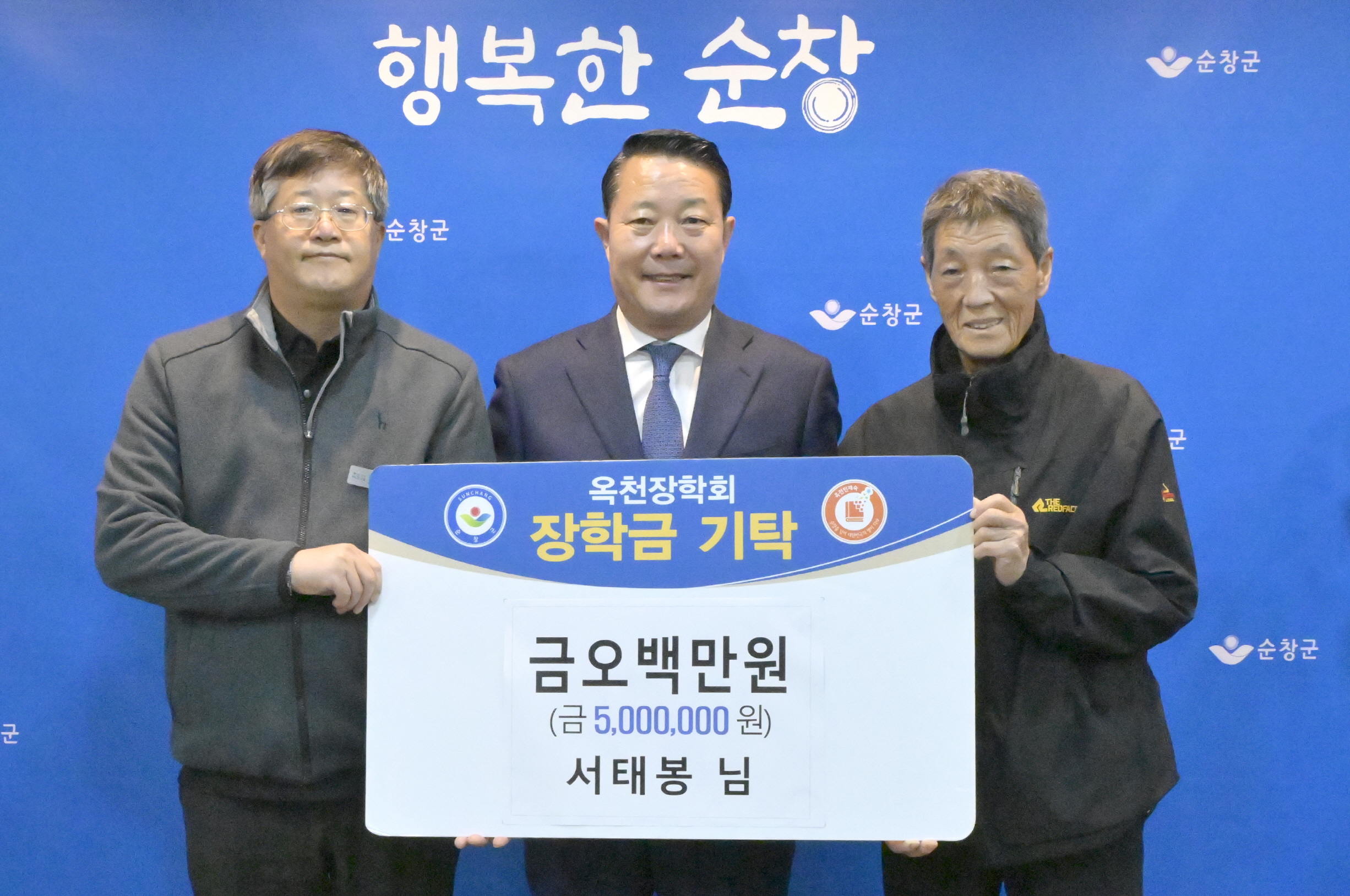 - 26일 순창읍에 거주하는 서태봉씨가 지역인재육성에 써달라며 장학금 500만원을 (재)순창군옥천장학회(이사장 최영일 순창군수)에 기탁했다. 장학금을 기탁한 서태봉씨는 순창읍에 거주하는 농업인으로 2023년, 2024년에 이어 올해도 지역 인재 양성을 위한 장학금을 기탁해 따뜻한 나눔을 3년째 이어가고 있다.