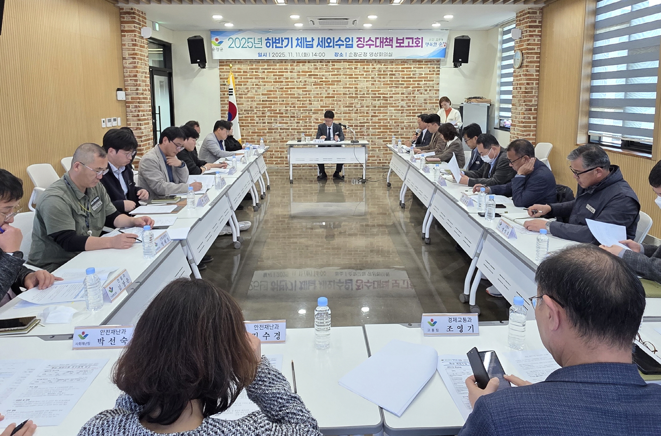 - 11일 군청 영상회의실에서 ‘2025년 하반기 세외수입 체납액 징수대책 보고회’를 개최했다. 조광희 부군수 주재로 열린 이번 보고회는 세외수입 체납액 비중이 큰 14개 부서 팀장 등 20여명이 참석한 가운데 부서별 체납현황을 분석하고, 목표달성을 위한 효율적인 징수계획에 대해 집중 논의했다. -2025.11.11.-