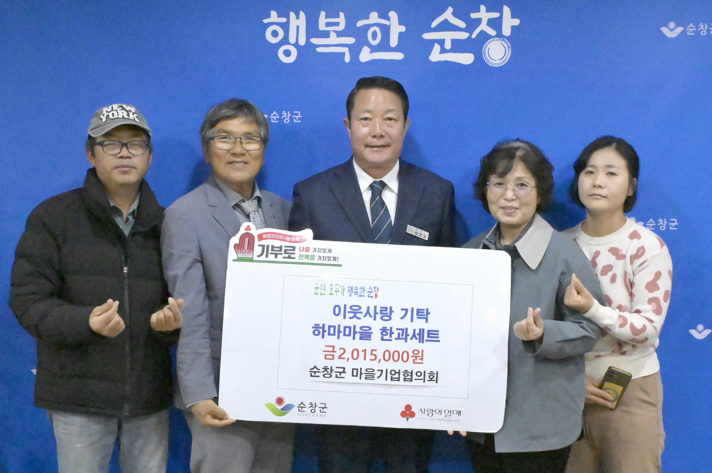 - 순창군 마을기업협의회(대표 양양임)는 순창군청을 방문해 취약계층과 사회복지시설을 위해 200만원 상당의 한과세트를 전달하며 훈훈한 지역사랑을 실천했다. 이번 나눔에는 하마마을(영), (영)가향식품, 순창쌀엿(영), 동고마을(영), 쌍치블루베리(협), 그리고 모두의 숲까지 총 6개 마을기업이 뜻을 모아 진행됐으며, 기부된 물품은 순창군 복흥면 하마마을에서 전통방식으로 만들어진 한과로 받는 이들에게 연말연시를 앞두고 따뜻한 온기를 전달할 것으로 기대된다. -2025.11.11.-