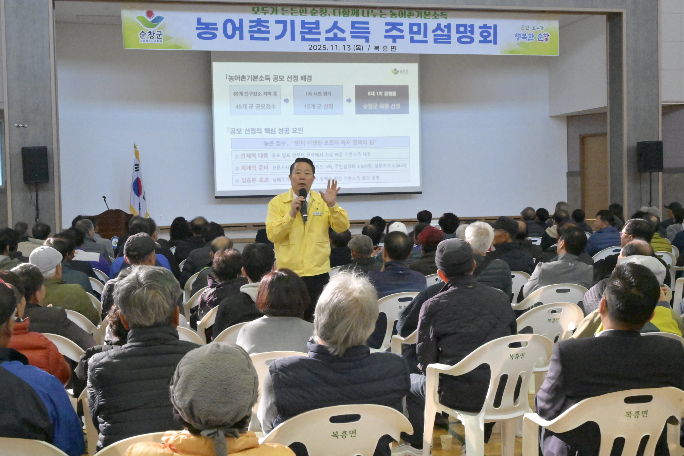 - 순창군이 농어촌기본소득 시범사업을 군민에게 정확히 알리고 이해도를 높이기 위해 11개 읍·면을 순회하는 ‘찾아가는 주민설명회’를 13일 복흥면을 시작으로 방문 설명이 시작했다. 이날 복흥면 설명회에서는 ▲농어촌기본소득의 기본 개념 ▲지급 대상 요건 ▲절차와 지급 방식 ▲재원 마련 방향 ▲기금 조성 계획 등이 자세히 소개됐다. 현장을 찾은 군민들은 사업 전반에 대해 다양한 의견을 제시하며 적극적으로 질문을 이어갔다. -2025.11.13.-