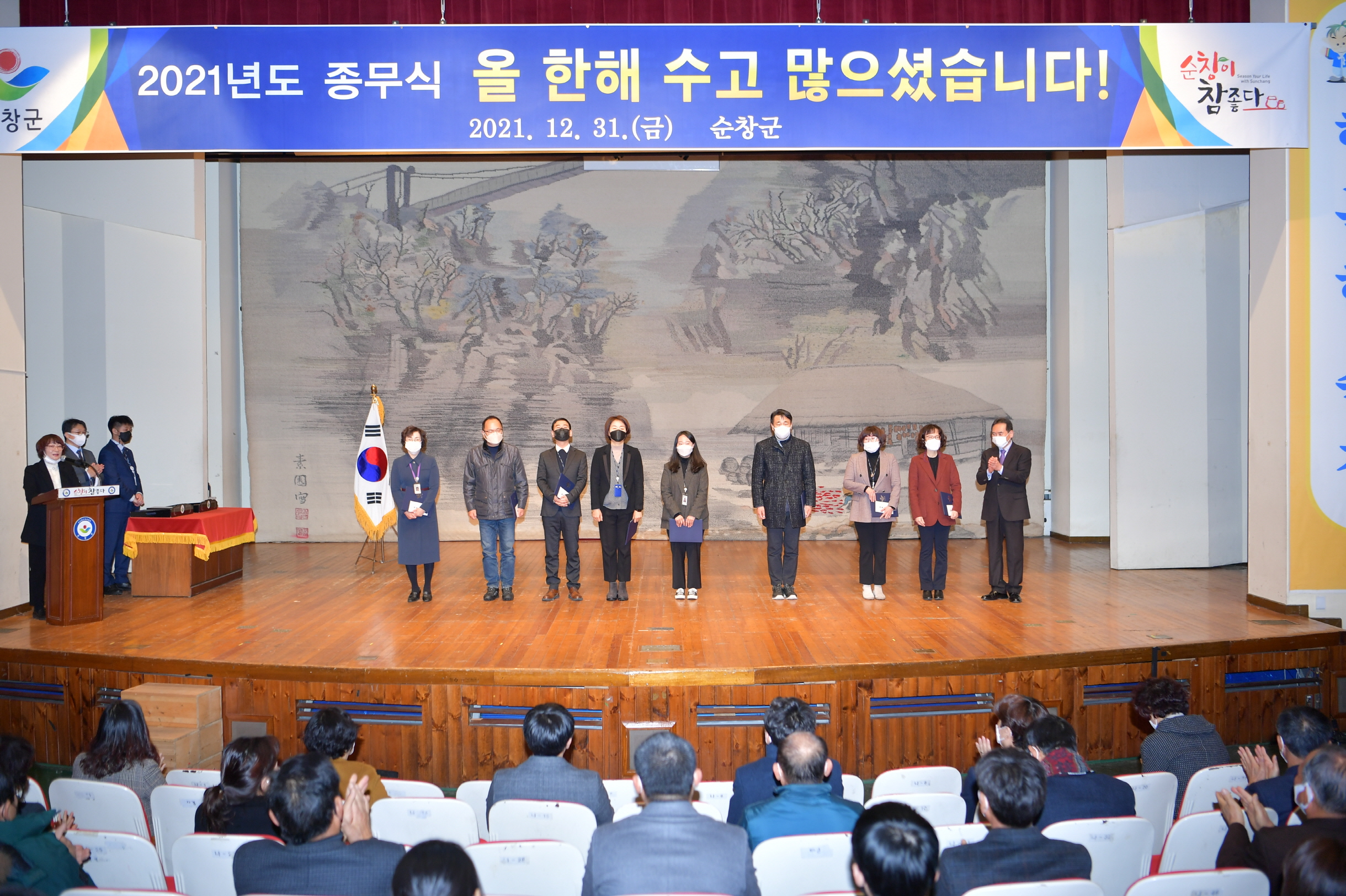 - 31일 순창군민회관 향토회관에서 2021년 순창군 종무식이 열렸다. 이날 한 해 동안 코로나 19, 태풍피해 등 군민들의 안전을 위해 고생한 직원들을 격려하고, 군정발전에 기여한 군민들에게 감사를 표했다. -2021년 12월 31일-