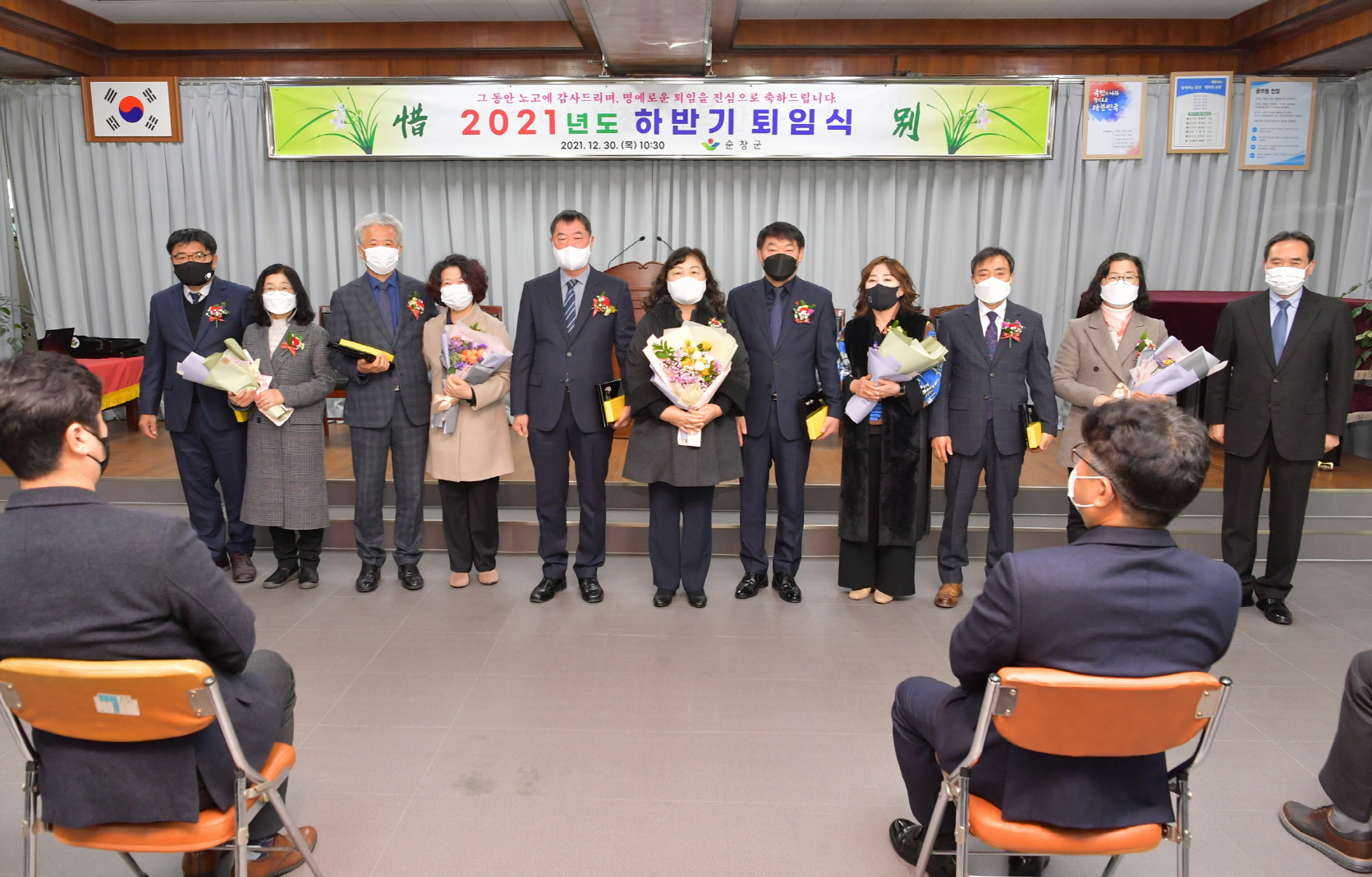 - 30일 올해를 마지막으로 순창군청을 떠나는 공무원들의 퇴임식이 열렸다. 이날 순창군청 3층 대회의실에서 퇴직공무원 5명과 가족, 후배 공무원들이 참석해 떠나는 선배 공무원들을 위로했다. 퇴임식은 퇴직자 소개, 공로패 전달, 송별사, 퇴임소감 등의 순으로 진행됐다. -2021년 12월 30일-