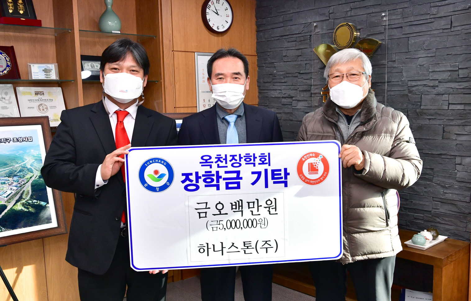 - ㈜하나스톤(대표 조영휘)은 30일 순창군청을 방문해 지역의 인재양성을 위해 써달라며 옥천장학회에 장학금 500만원을 전달했다. ㈜하나스톤은 순창군 팔덕면에 위치해 구조형 콘크리트를 제작해 판매하는 기업이다. ㈜하나스톤은 매해 지역 인재양성과 불우이웃을 위해 크고 작은 성금을 기탁하며 지역사회의 귀감이 되고 있는 기업이다. -2021년 12월 30일-