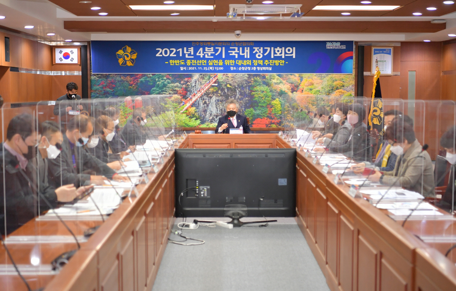 - 민주평화통일자문회의 순창군협의회(회장 윤영식)는 25일 순창군청 2층 영상회의실에서 황숙주 군수를 비롯한 자문위원과 관계자 30여명이 참석한 가운데 2021년 4분기 정기회의를 개최했다. 이날 회의는 4분기 주제인 ‘한반도 종전선언 실현을 위한 대내외 정책 추진방안’ 대한 자문위원의 이해제고를 통한 의견수렴과 공감대 확산을 위해 실시 됐으며, 정책건의를 위한 자문위원 토론 및 설문지 작성, 협의회 안건 토의 및 보고사항 순으로 진행됐다. -2021년 11월 25일-