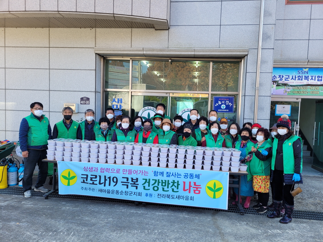 - 새마을운동순창군지회(회장 양걸희)는 17일 지역 내 소외계층 및 홀몸 어르신 150세대에‘건강반찬 나눔 활동’을 펼쳤다. 이 행사는 새마을지도자순창군협의회(회장 설재희), 순창군새마을부녀회(회장 정삼남), 새마을문고순창군지부(회장 윤영옥)과 새마을단체 회원 30여명이 함께했다. -2021년 11월 17일-