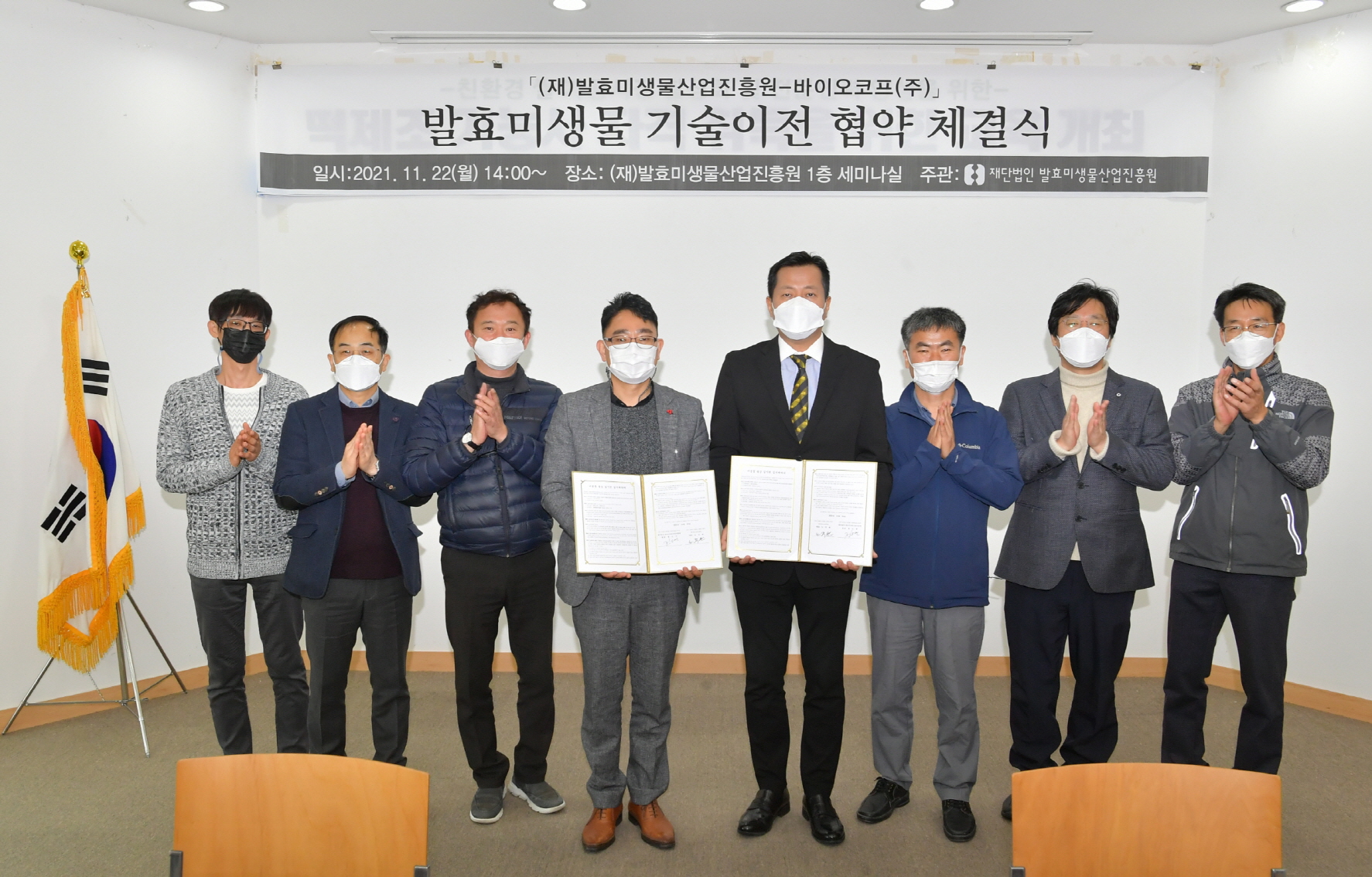 - 순창군 재단법인 발효미생물산업진흥원과 바이오코프(주)는 22일 발효 미생물 산업 관련 공동연구 및 조사, 실용화에 상호협력하기로 하는 내용의 업무협약을 체결했다. 또한 발효미생물산업진흥원이 독자 개발한 토종 기능성 균주를 바이오코프에서 상용화하기로 하고, 이를 위한 실시계약도 맺었다. -2021년 11월 22일-