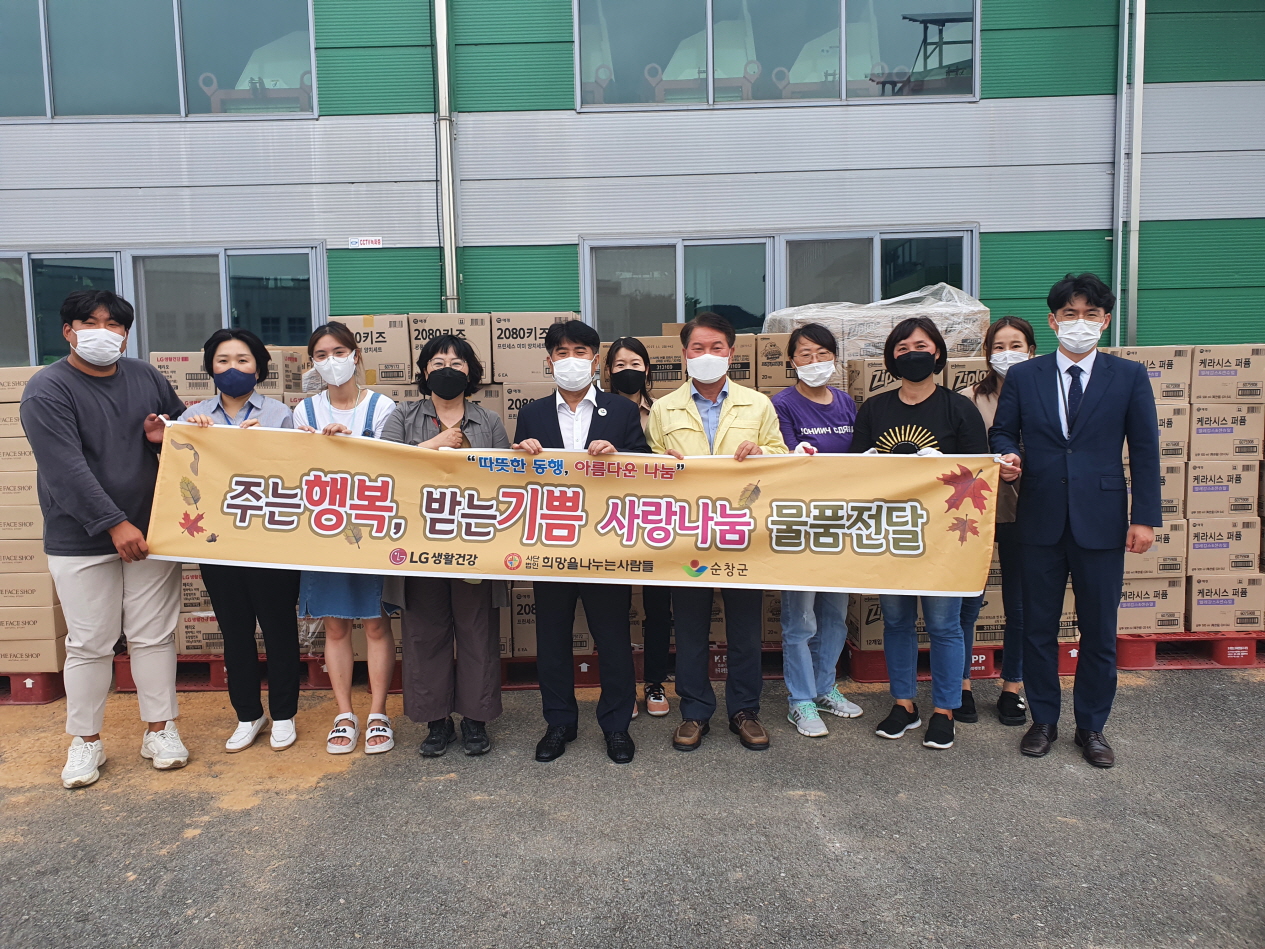 - 순창군은 13일 (사)희망을나누는사람들(회장 김정안)들로부터 1억원 상당의 후원 물품을 전달받았다. 이날 희망을나누는사람들은 LG생활건강에서 후원받은 약 1억원 상당의 삼푸와 치약, 주방 세제, 섬유유연제, 마스크팩, 선크림 등의 생필품을 전달했다. 순창군은 전달받은 물품을 지역 내 저소득층과 드림스타트 아동, 지역아동센터, 청소년수련관, 청소년상담복지센터, 하늘빛 그룹홈, 장애인거주시설, 다문화지원센터, 자원봉사 종합센터 등에 배부할 계획이다. -2021년 9월 13일-
