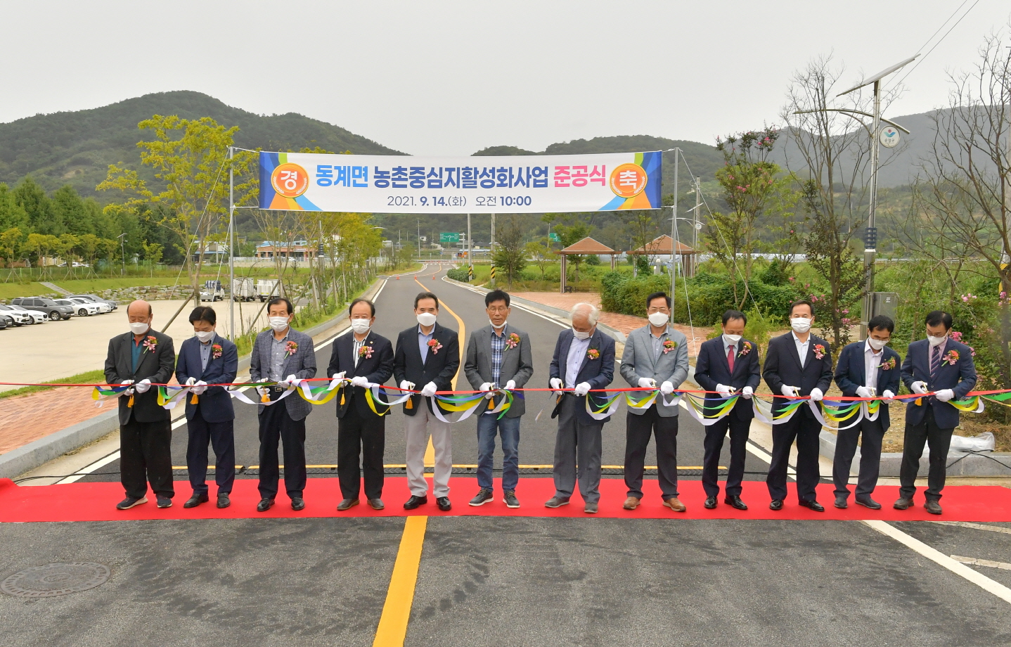 - 14일 동계면민들의 숙원인 동계면 농촌중심지 활성화사업을 완료하고 동계면 우수저류시설에서 준공식을 가졌다. 이날 준공식에는 황숙주 군수를 비롯한 신용균 군의회 의장과 의원, 내․외빈과 주민 등 90여 명이 참석했다. 준공식은 내․외빈 소개, 국민의례, 감사패 전달, 경과보고, 축사, 테이프 커팅, 시설관람 순으로 진행됐다. -2021년 9월 14일-