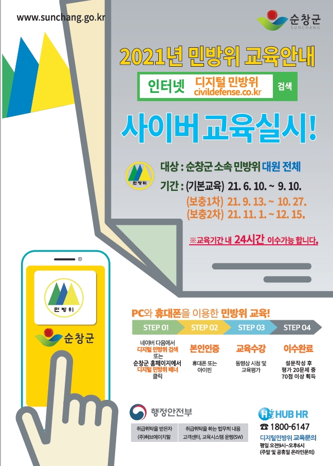 - 순창군이 2021년도 민방위 대원 사이버 보충교육(1차)을 다음달 27일까지 실시한다. 교육은 PC나 모바일 기기를 통해 들을 수 있고, 인터넷 포털사이트 검색 창에 ‘디지털민방위’를 검색 후 본인인증을 마치고 교육을 이수하면 된다. 교육과정은 1시간 분량의 동영상을 시청 후 70점 이상의 점수를 취득하면 교육이수가 완료된다. -2021년 9월 14일-