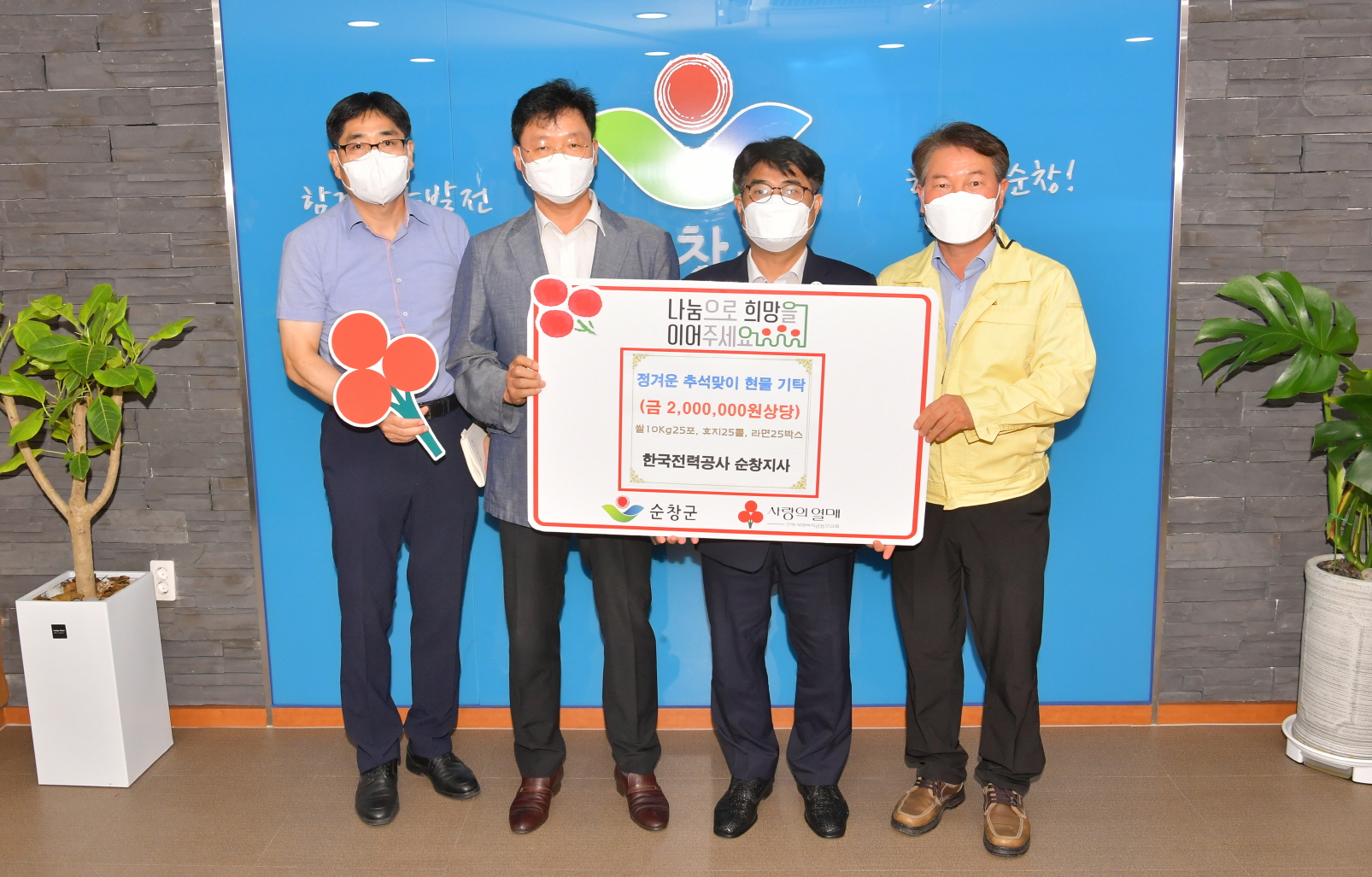 - 한국전력공사 순창지사(지사장 공복현)는 14일 순창군청을 방문해 추석을 맞아 관내 소외계층을 위해 써달라며, 200만원 상당의 ‘달빛소원꾸러미’를 전달했다. 이날 전달식에는 이남섭 순창부군수를 비롯해 공복현 지사장 및 한전 관계자들이 참석했다. 달빛소원꾸러미에는 라면 1박스, 휴지 1롤(30개입), 쌀10kg 등 들어있으며, 이날 전달받은 꾸러미는 기초수급자 및 저소득가정 25가구에 전달됐다. -2021년 9월 14일-