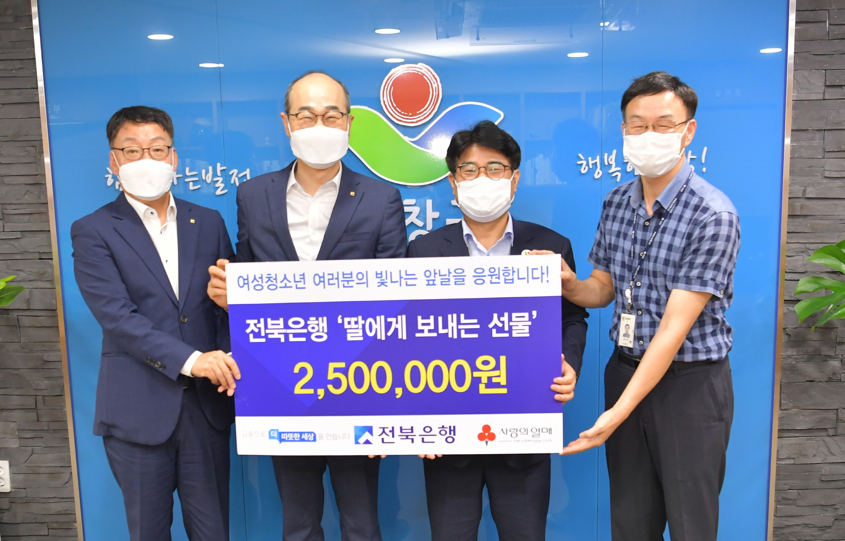 - JB금융그룹 전북은행(은행장 임용택)이 추석을 맞아 1일 순창군청을 찾아 ‘딸에게 보내는 선물’ 전달식을 가졌다. 이날 전달식에는 이남섭 순창부군수, 전북은행 이성란 부행장, 유인성 순창지점장 등이 참석했다. 이날 기탁된 물품은 여성용품으로 구성한 선물꾸러미 100박스(250만원 상당)로, 관내 저소득가정 청소년에게 전달될 예정이다. -2021년 9월 1일-