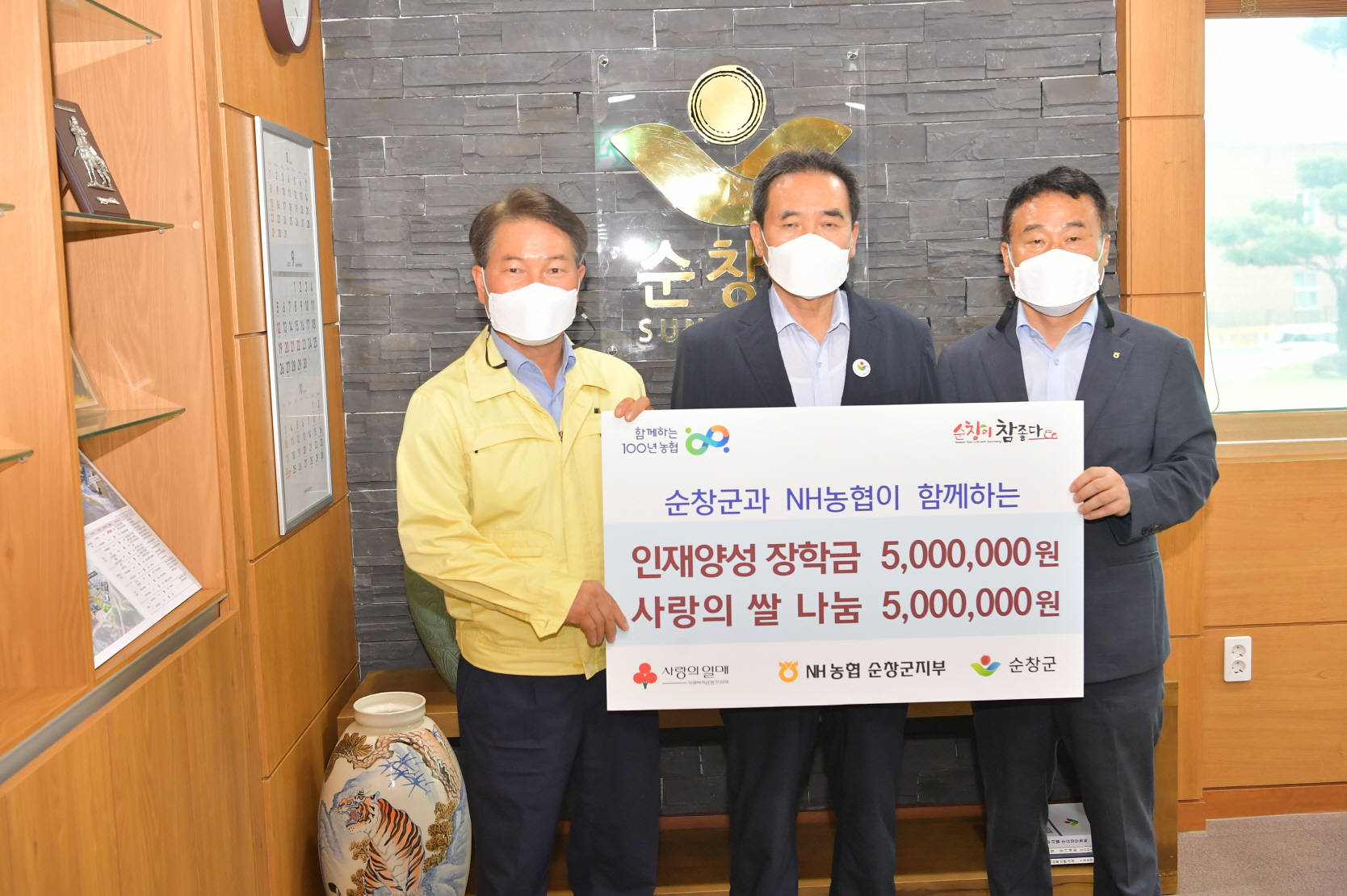 - NH농협 순창군지부(지부장 김현수)는 2일 추석 명절을 맞이해 지역인재양성과 교육발전을 위해 순창군에 500만원의 장학금과 취약계층 지원을 위해 쌀 20kg 등 500만원 상당의 물품을 순창군에 전달했다. -2021년 9월 2일-