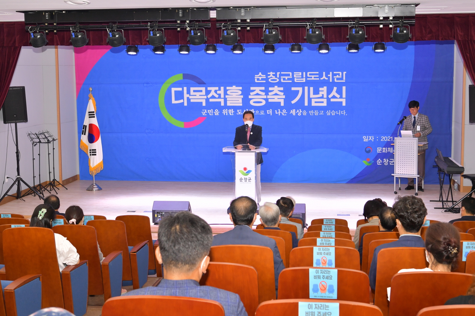 - 3일 군립도서관 다목적홀 증축을 마치고 기념식을 가졌다. 이날 기념식에 황숙주 순창군수와 신용균 순창군의회 의장, 순창군의회 의원 등이 참석해 다목적홀 증축을 축하했다. 이날 기념식은 경과보고, 기념사, 축사 등의 순으로 진행됐으며, 도서관 앞에 “글은 세상에서 가장 높은 문화”라는 표지석과 함께 팔덕면 태자마을 이현주씨의 기증으로 반송을 기념 식수했다. -2021년 9월 3일-