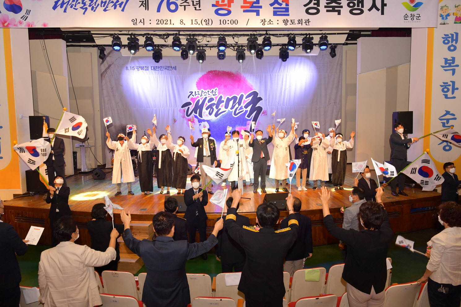 - 제76주년 광복절 경축행사 경건하게 치러져 15일 순창 향토회관에서 군민 90여 명이 참석한 가운데 제76주년 광복절 경축행사를 가졌다. 이날 행사에는 황숙주 순창군수를 비롯 순창군의회 신용균 의장과 순창군의회 의원, 기관.사회단체장, 지역사회 각계각층의 군민이 모여 조국을 위해 희생하신 선열들의 숭고한 희생을 기리고 애국심을 고취했다. 순창군은 현재 사회적 거리두기 2단계로 코로나19 방역수칙을 준수하며 엄숙한 가운데 차분하게 행사를 진행했다. -2021년 8월 15일-
