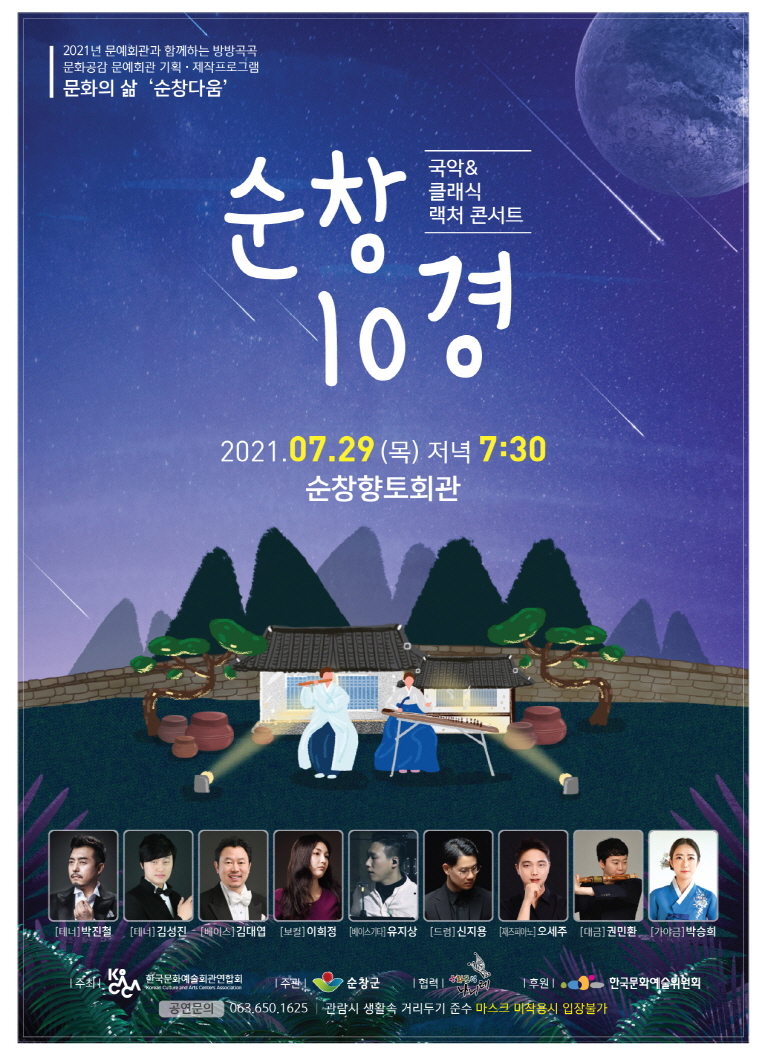 - 오는 29일 향토회관에서 열릴 예정인 ‘순창 10경 콘서트’ 공연을 사회적 거리두기 2단계 방역수칙을 준수하며 진행할 예정이었으나, 최근 전국적인 코로나19 확진자 증가로 방역단계가 격상됨에 따라 비대면 공연으로 전환하기로 했다. 이번 공연은 전북에서 활발한 활동을 이어가는 문화포럼 나니레에서 선보이며, 국악과 클래식의 협업으로 순창의 아름다운 자연경관, 문화유적 및 설화를 바탕으로 하는 10가지 테마를 주제로 공연을 펼칠 예정이다. -2021년 7월 27일-