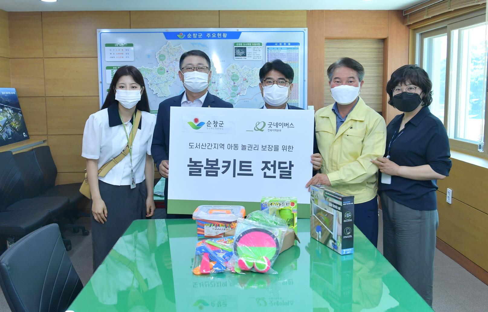 - 굿네이버스 전북지역본부(본부장 김경환)는 27일 순창군청을 방문해 부군수실에서 전라북도 내 도서산간지역 아동들의 놀 권리 보장을 위한 ‘놀봄키트’ 전달식을 가졌다. ‘놀봄키트’는 인프라 부족으로 다양한 놀이 콘텐츠를 접하기 어려운 도서산간지역 아동의 건강한 성장을 위해 발목줄넘기, 빨대블럭, 스피드컵, 캐치볼 세트, 부메랑, 짐볼, 탁구공세트 등 5만원 상당의 운동 관련 놀이 물품으로 구성됐다. -2021년 7월 27일-