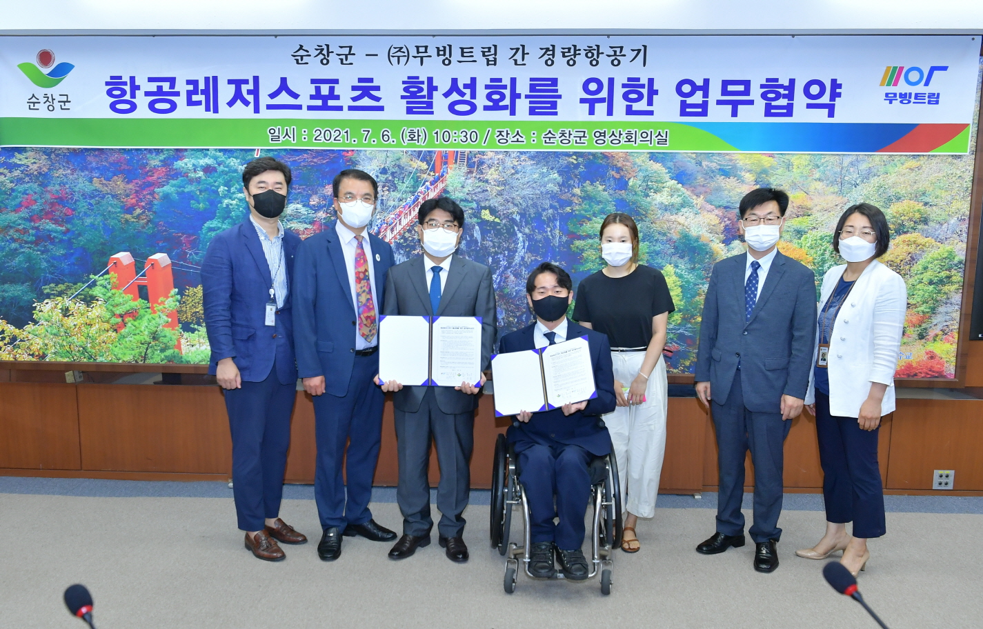 - 6일 관광객에게 풍부한 즐길거리를 제공하고자 ㈜무빙트립(대표 신현오)과 경량항공기 항공레저스포츠 운영 활성화를 위한 업무협약을 맺었다. 이날 협약식은 군청 2층 영상회의실에서 이남섭 순창부군수를 비롯해 ㈜무빙트립 신현오 대표와 김설화 팀장, 행정 관계자 등이 참석했다. 이번 협약은 경량항공기 항공레저스포츠 운영 활성화 및 관광객 유치를 위한 것으로, 양 측은 항공레저스포츠 운영을 위한 이착륙장 부지사용 협조와 지역 관광활성화를 위한 공동 홍보, 여행객 모집 등에 서로 협력키로 했다. -2021년 7월 6일-