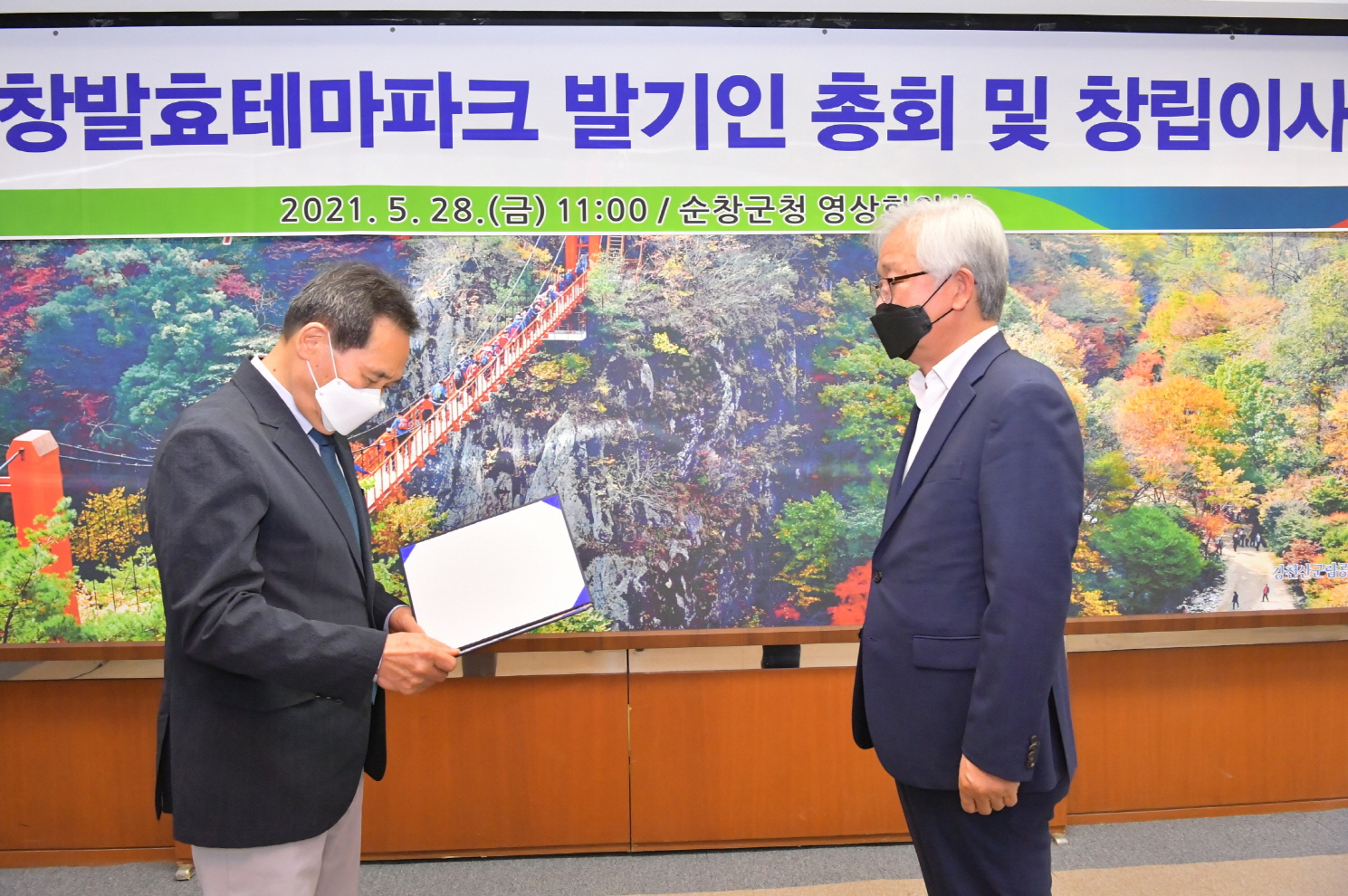 - 28일 군청 영상회의실에서 재단법인 순창발효테마크 임원 13명이 참석한 가운데 순창발효테마파크관리운영재단 창립총회를 개최했다. 이번 총회에서 이사 임명, 설립취지문 채택, 정관, 2021년도 사업계획 및 예산 등을 심의·의결하고 재단 출범을 가시화했다. -2021년 5월 28일-