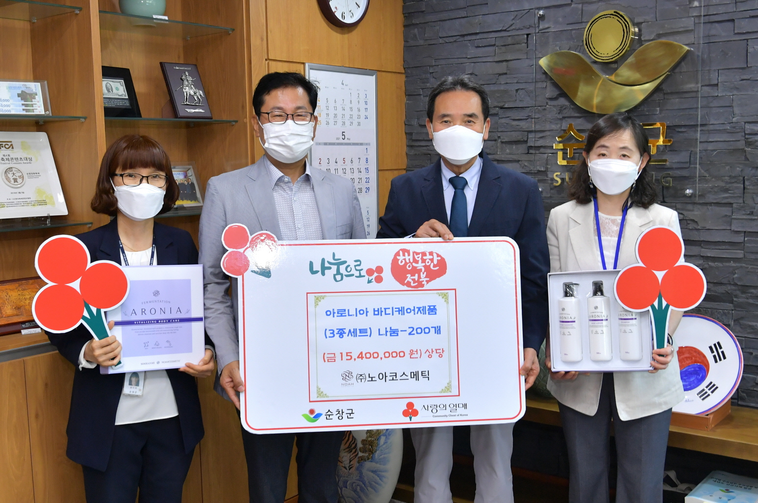 - 광주소재 화장품 전문 생산·판매 회사인 ㈜노아코스메틱(대표 이한수)에서 28일 코로나19로 어려움을 겪고 있는 이웃을 위해 써달라며 아로니아 바디케어제품 200세트(시가 1,540만원 상당)를 순창군에 기탁했다. -2021년 5월 28일-