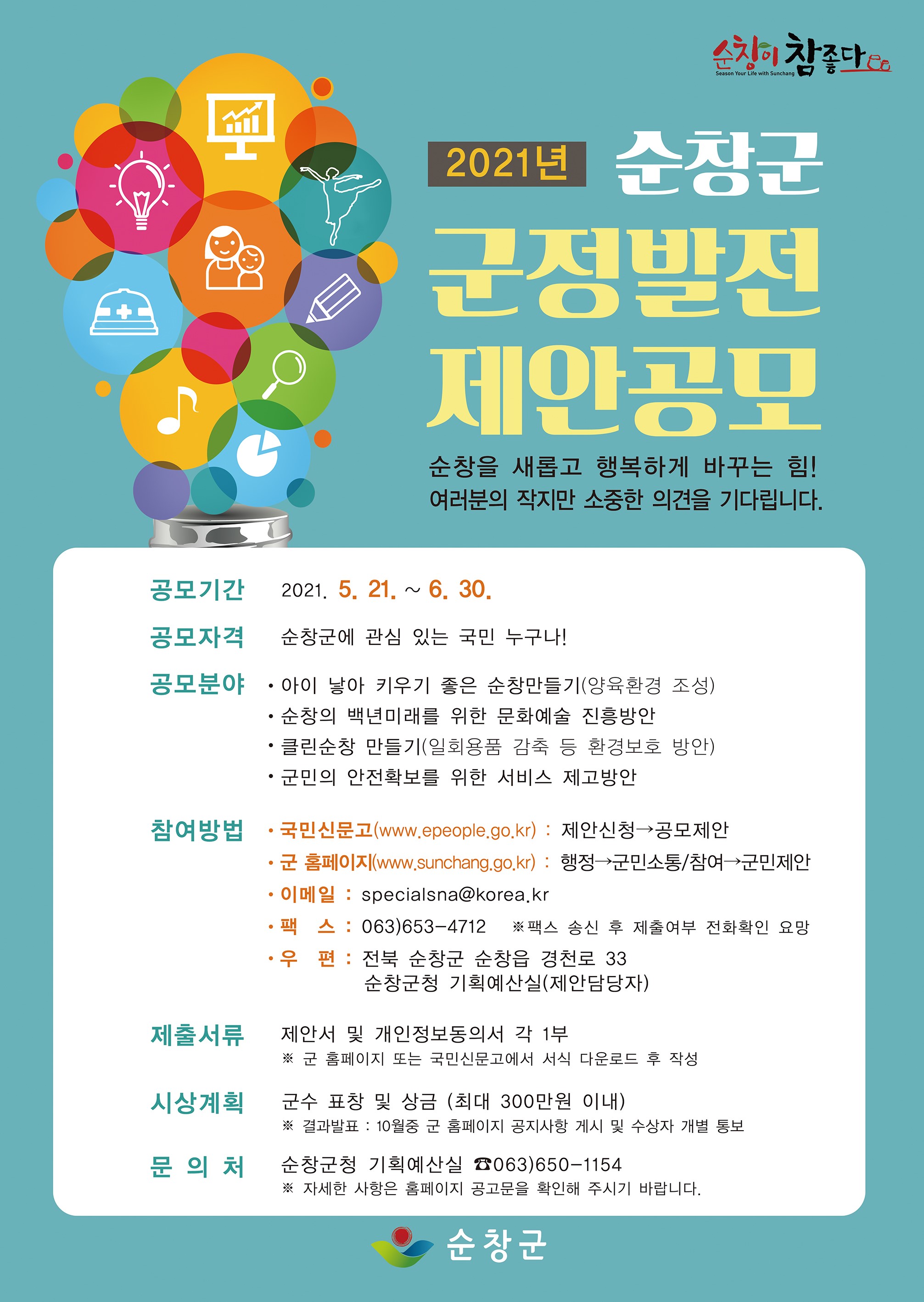 - 순창군은 지속가능한 미래를 함께 고민하고, 열린 소통행정을 구현하고자 오는 6월 30일까지「2021년 군정발전 제안공모」를 통해 참신한 아이디어를 모집한다. 제안분야는 ▲아이 낳아 키우기 좋은 순창만들기(양육환경 조성) ▲순창의 백년미래를 위한 문화예술 진흥방안 ▲ 클린순창 만들기(일회용품 감축 등 환경보호 방안) ▲ 군민의 안전확보를 위한 서비스 제고방안 등 총 4개 주제다. 문의 : 순창군청 홈페이지 또는 순창군청 기획예산실(☎063-650-1103, 1154), 제안접수처 : 전자우편(specialsna@korea.kr) 또는 팩스(063-653-4712) -2021년 5월 31일-