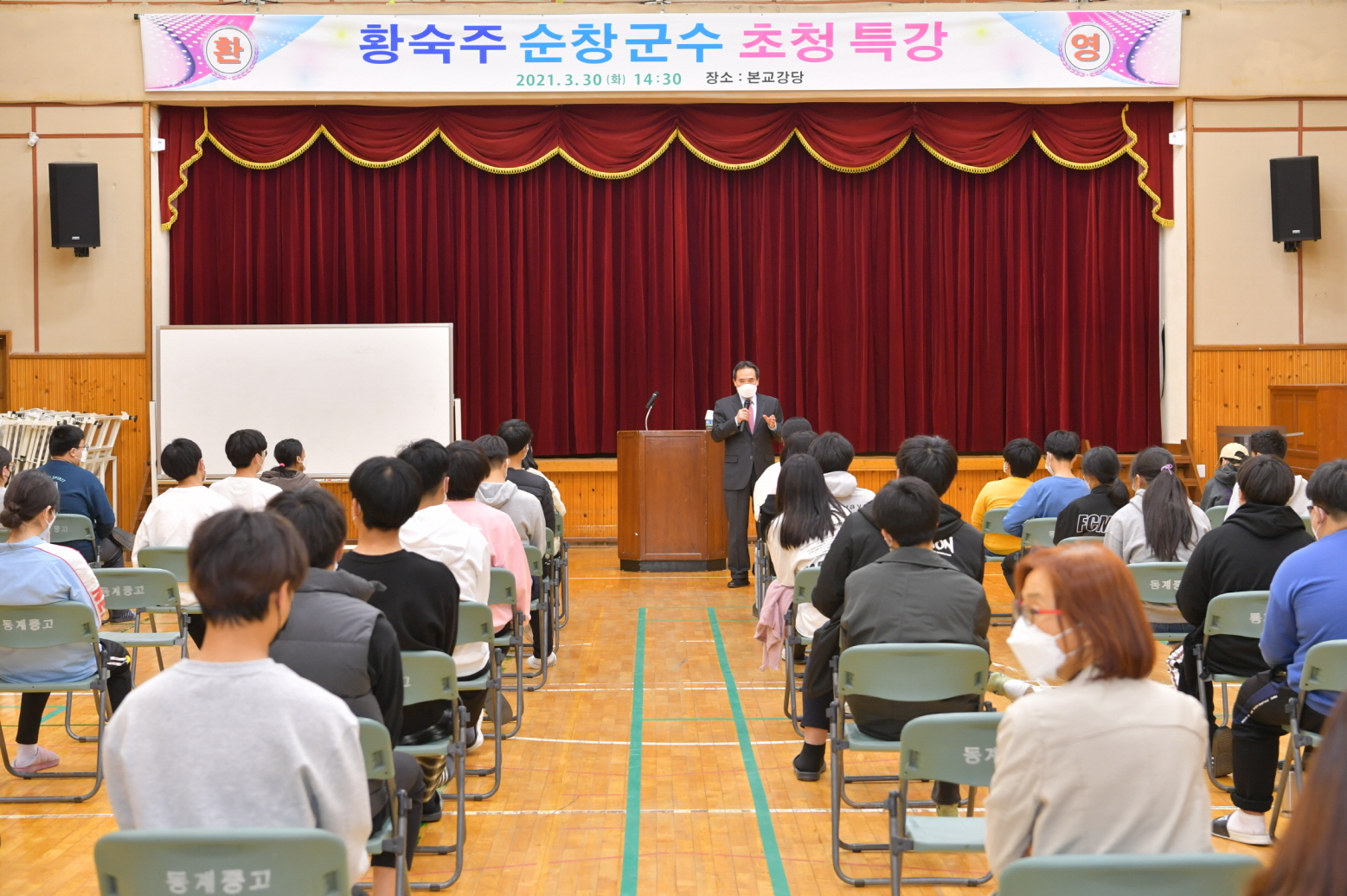 - 황숙주 순창군수가 30일 동계중‧고등학교 강당에서 전교생을 대상으로 ‘세상을 움직이는 힘은 꿈과 희망, 그리고 신념’이란 주제로 강의를 진행하며 만남의 시간을 가졌다. 이날 강의는 황군수의 다양한 도전과 어려움을 극복한 경험담부터 동계면 출신 성공 인사에 대한 소개까지 학생들이 지역에 대한 자긍심과 자부심을 가지고 꿈을 키워 나갈 수 있는 이야기로 꾸며졌다. -2021년 3월 30일-