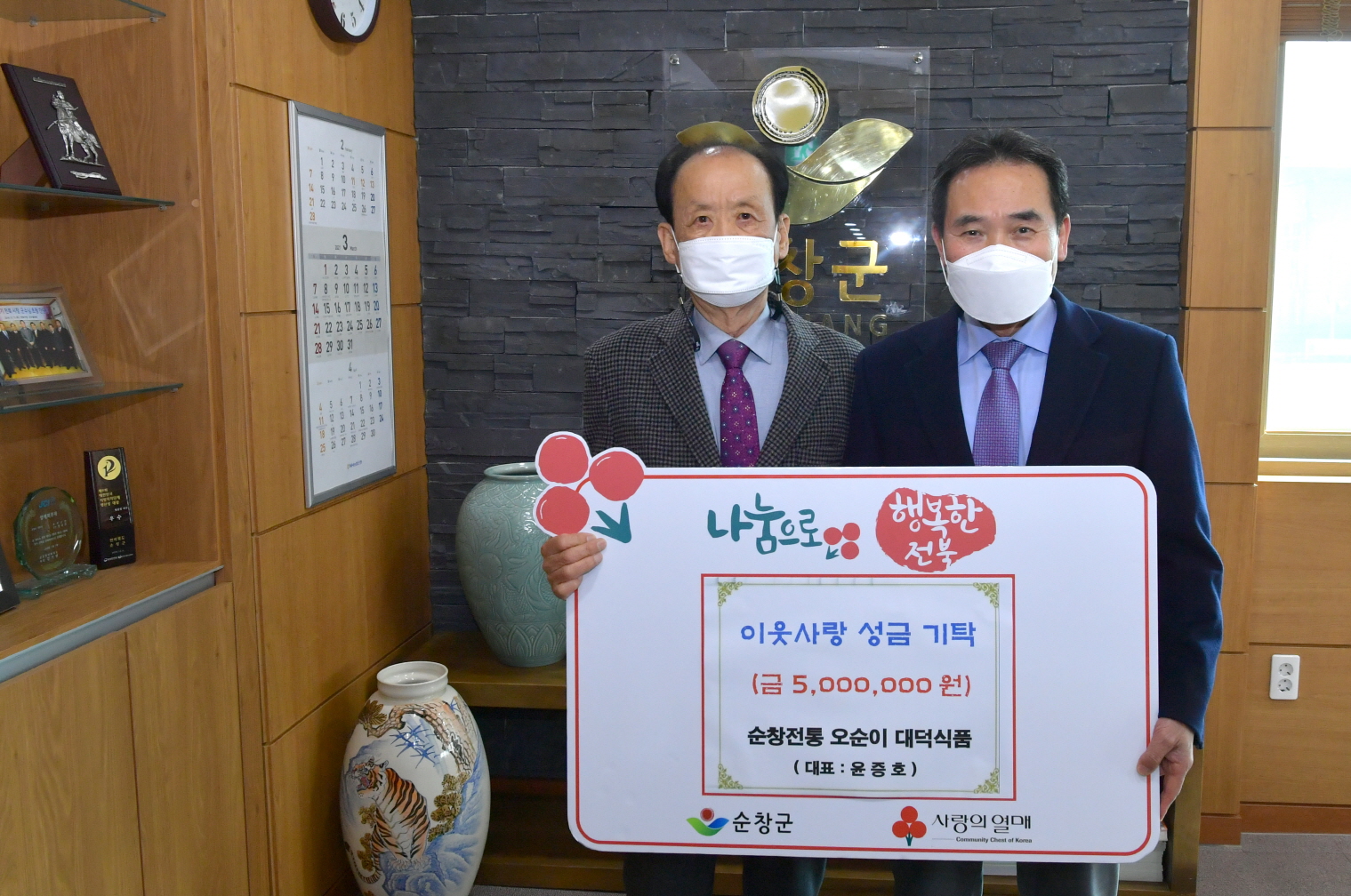 - 순창전통오순이대덕식품 윤증호(88) 대표가 8일 순창군청을 방문해 코로나-19로 생활이 어려운 저소득층 가정을 위해 써달라며 순창군에 500만원을 전달했다. 남원에서 태어나 순창에 정착한 지 올해로 60년이 되었다는 윤증호 대표는 “성실하게 열심히 일하면 반드시 성공이라는 보상이 따르기 마련이고, 매년 성금을 기탁하는 것은 자녀들에게 본보기가 되어 이웃사랑을 실천하고 살아가라는 뜻이 담겨 있다”고 전했다. -2020년 3월 8일-