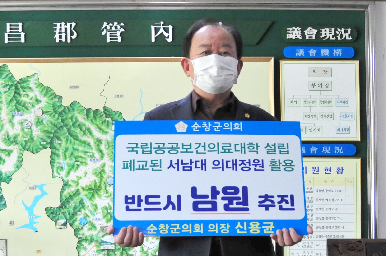 - 순창군의회 신용균 의장이 16일 ‘남원 국립공공보건 의료대학설립 챌린지’에 동참했다. 신용균 의장은“공공의대 설립은 낙후된 지역의 보건의료서비스 질을 개선함으로써 지역 간 격차를 해소하고 지역 균형 발전의 초석이 될 수 있다.”며“남원 국립공공의대 설립이 조속히 이뤄지길 바란다.”고 밝혔다. -2020년 2월 17일-
