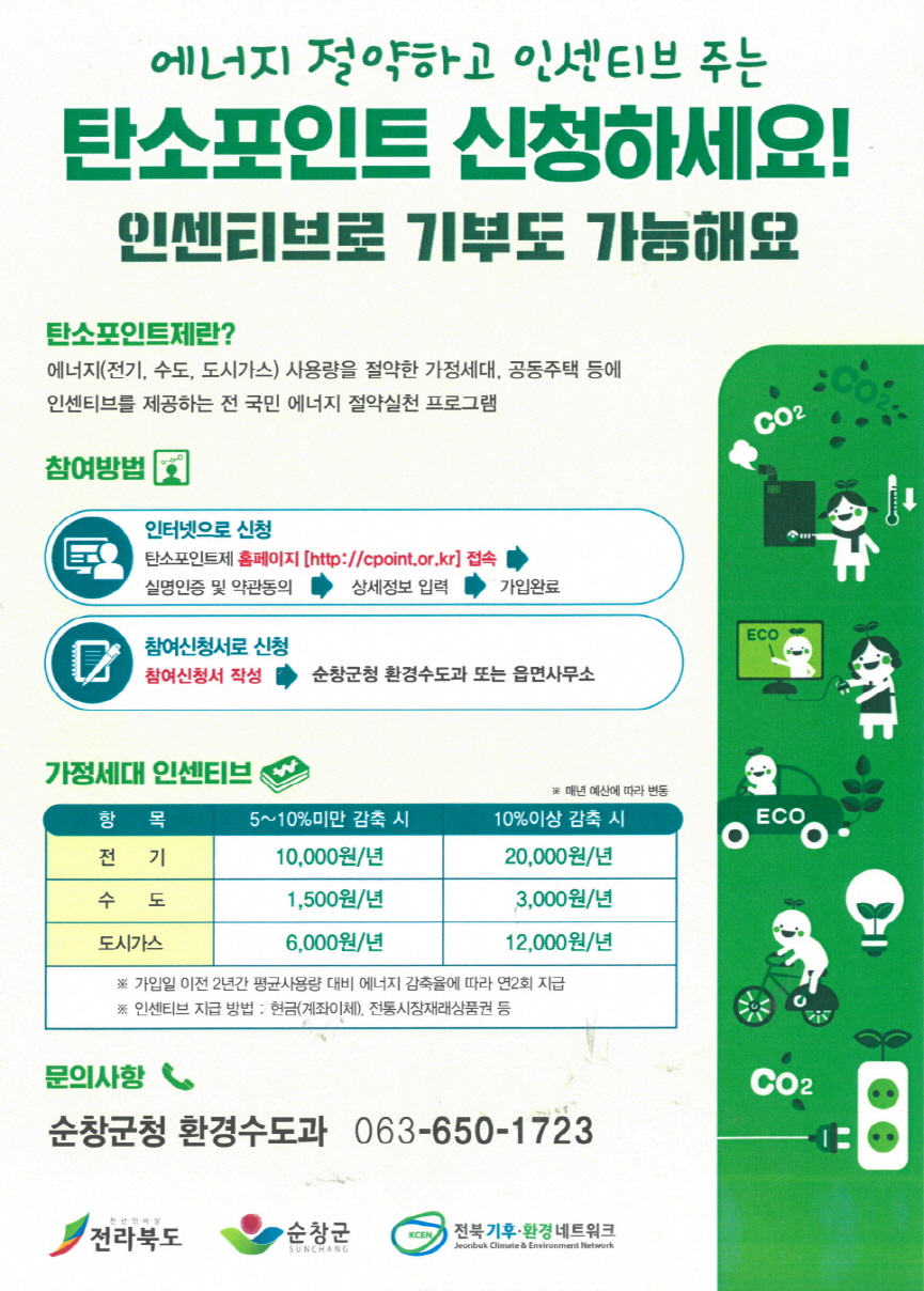 - 순창군이 전기, 상수도, 도시가스 등 에너지 사용량 절감 실적에 따라 인센티브를 받을 수 있는 탄소포인트제 참여세대를 모집한다. ‘탄소포인트제’는 개인, 상업시설 등의 에너지(전기, 상수도, 도시가스) 사용량 절감실적에 따라 포인트를 산정해 연2회(상·하반기) 현금이나 상품권, 그린카드 포인트 등 인센티브를 제공하는 온실가스 감축 실천 프로그램이다. 문의순창군청 환경수도과(063-650-1723). -2021년 2월 2일-