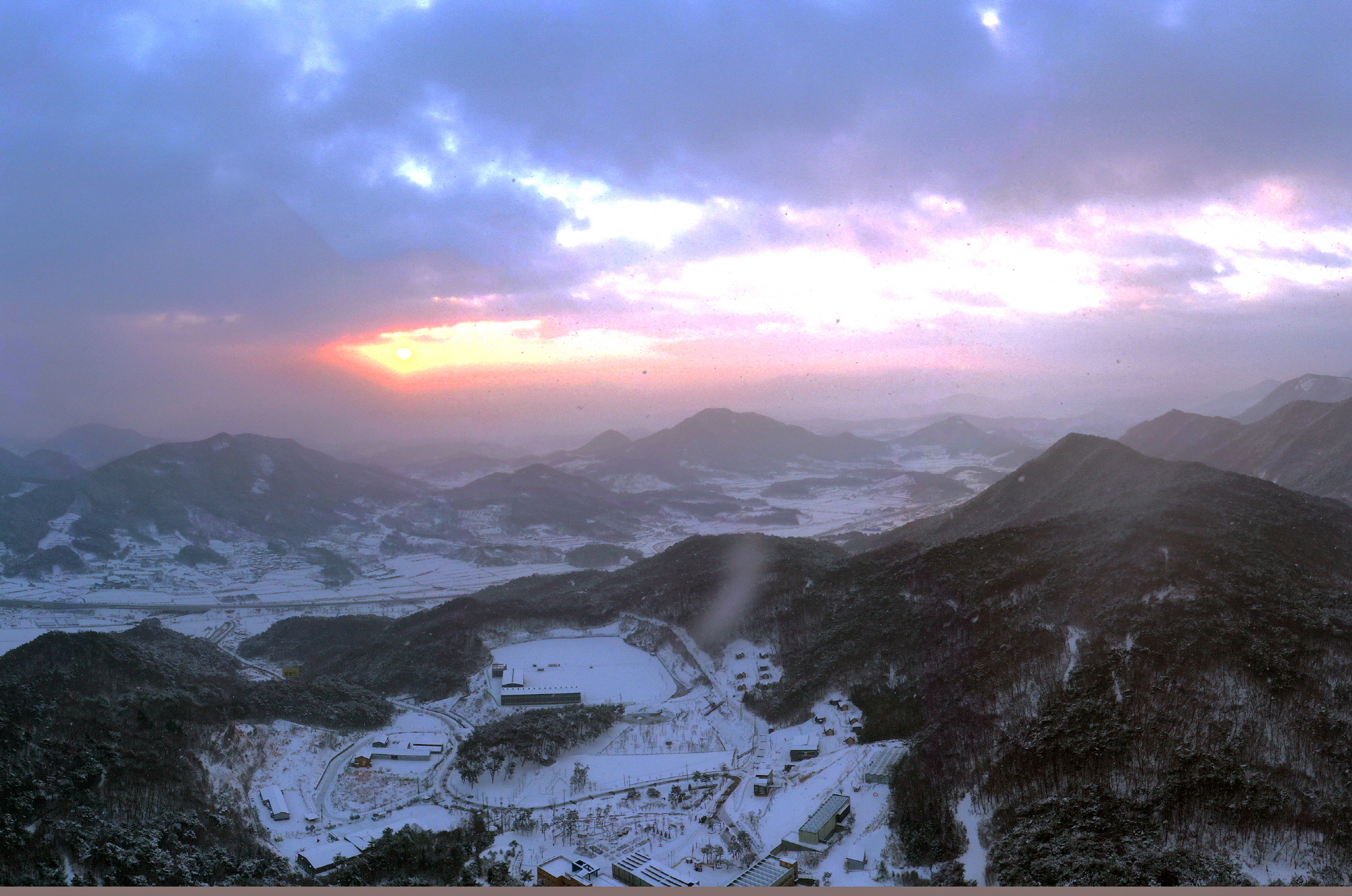 - 새해 첫날 인계면 쌍암리 건강장수연구소가 있는 황독이에 함박눈이 내리는 와 중에서도 장엄한 일출이 펼쳐지고 있다. 순창군은 2021년 신축년(辛丑年)을 맞아 군정철학 사자성어를 ‘노겸근칙 (勞謙謹勅)’으로 정했다. 천자문 후반부 구절에‘서기중용(庶幾中庸) 노겸근칙(勞謙謹勅)’으로‘매사에 중용의 묘를 이루려면, 공로(善德公勞)에 힘쓰고 겸손하며 근신하고 단단히 타일러 경계하면 실수가 없다’는 뜻이라 한다. 공직자들이 「군민 모두가 행복한 순창」을 위해 힘을 합쳐 노력하면서, 잘못을 경계하면 군민 모두가 행복한 한해가 될 것으로 굳게 믿고 꼭 실천하겠다는 의지를 표명 한 것이다. (글씨 : 은파(隱坡) 노민(盧旼) -2021년 1월 1일-