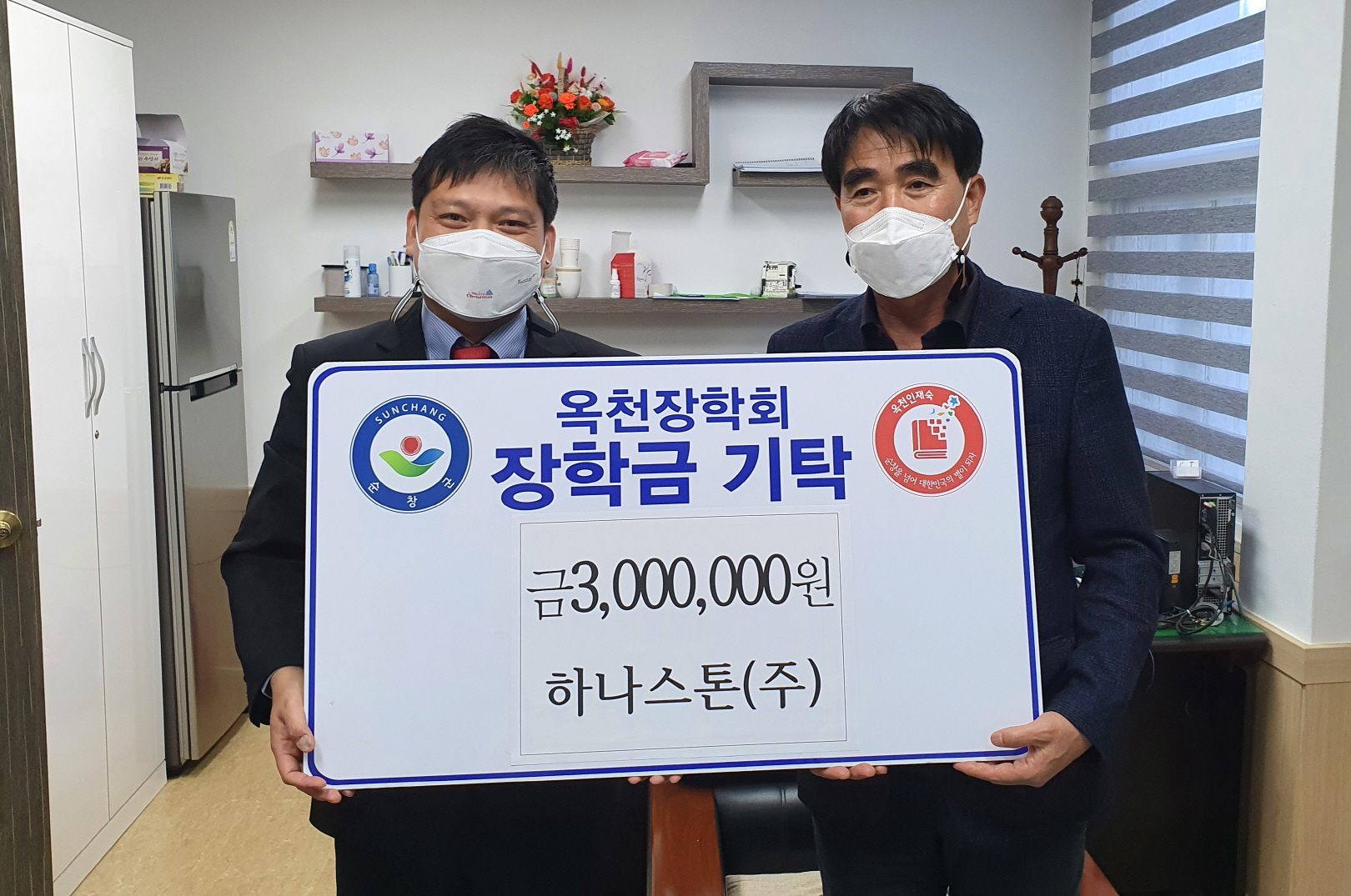 - 순창군 옥천장학회에 코로나19 확산으로 힘든 시기임에도 장학금 기부가 이어지고 있다. 상주식회사에서 1천만원, 임순여객과 옥천콘크리트에서 각각 5백만원, 하나스톤(주)과 순창기업사에서 각각 3백만원 등 연말에도 순창의 인재양성을 위한 기부가 잇따르고 있다. 옥천인재숙에서는 올해에도 서울대 2명 등 수도권 대학에 15명이 합격하고 사관학교에 2차 시험까지 7명이 합격하는 등 꾸준한 성과를 이어나가고 있다. -2020년 12월 30일-