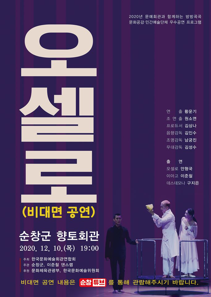 - 순창군이 사회적 거리두기 2단계가 진행함에 따라 10일에 열릴 예정이었던 ‘오셀로’ 공연을 비대면 공연으로 진행했다. -2020년 12월 10일-