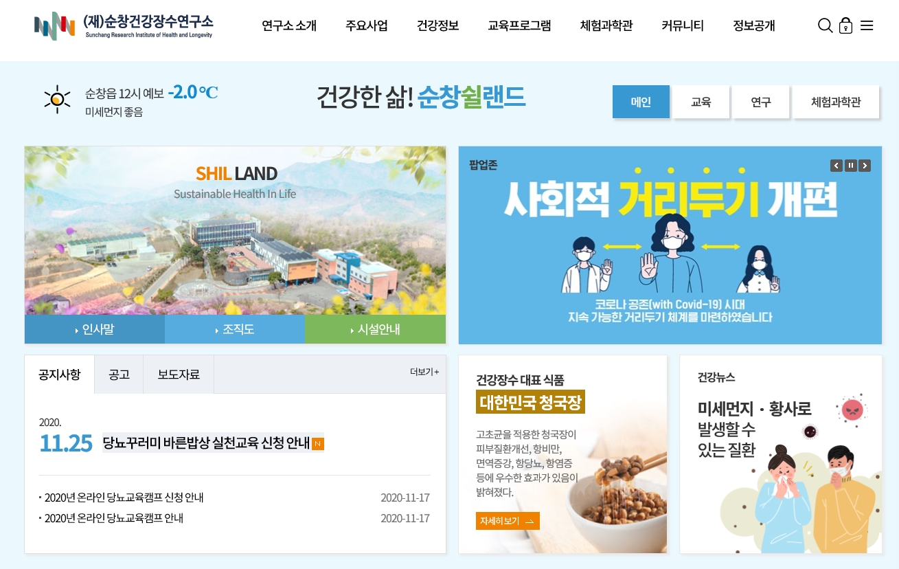 - 건강장수와 힐링의 메카로 발돋움하고 있는 순창군이 오는 30일까지 포스트 코로나 시대를 대비해 그동안 추진했던 숙박·체험형 교육에서 탈피해, 비대면 방식의 온라인 교육 프로그램을 진행한다. 순창군 건강장수사업소에서 진행되는 이번 교육은 ‘노후준비교육’과 ‘바른식생활교육’이다. 이중 ‘노후준비교육’은 보건복지부 국정과제로 인구 고령화에 대비하여 전국 40대 이상 중·노년층 희망자를 대상으로 4대분야(건강, 재무, 관계, 여가) 강의와 실습·체험 프로그램을 통해 미리 노후를 준비하도록 돕고 있다. -2020년 12월 14일-
