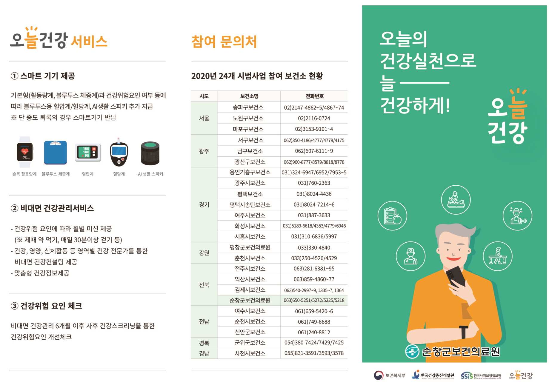 - 순창군이 ICT(정보통신기술)를 활용한 비대면 어르신 건강관리서비스사업 참여자 400명을 선착순으로 모집한다. 모집 대상자는 스마트폰을 소지하고 있는 만60세 이상 순창군민이며, 대상자 중 아이폰 사용자, 노인장기요양등급자, 국민건강보험공단 만성질환 자가측정기기 지원 대상자, 보건소 모바일 헬스케어 참여자는 제외된다. 문의 순창군보건의료원 지역보건계 (☎063-650-5225, 5218) -2020년 12월 07일-