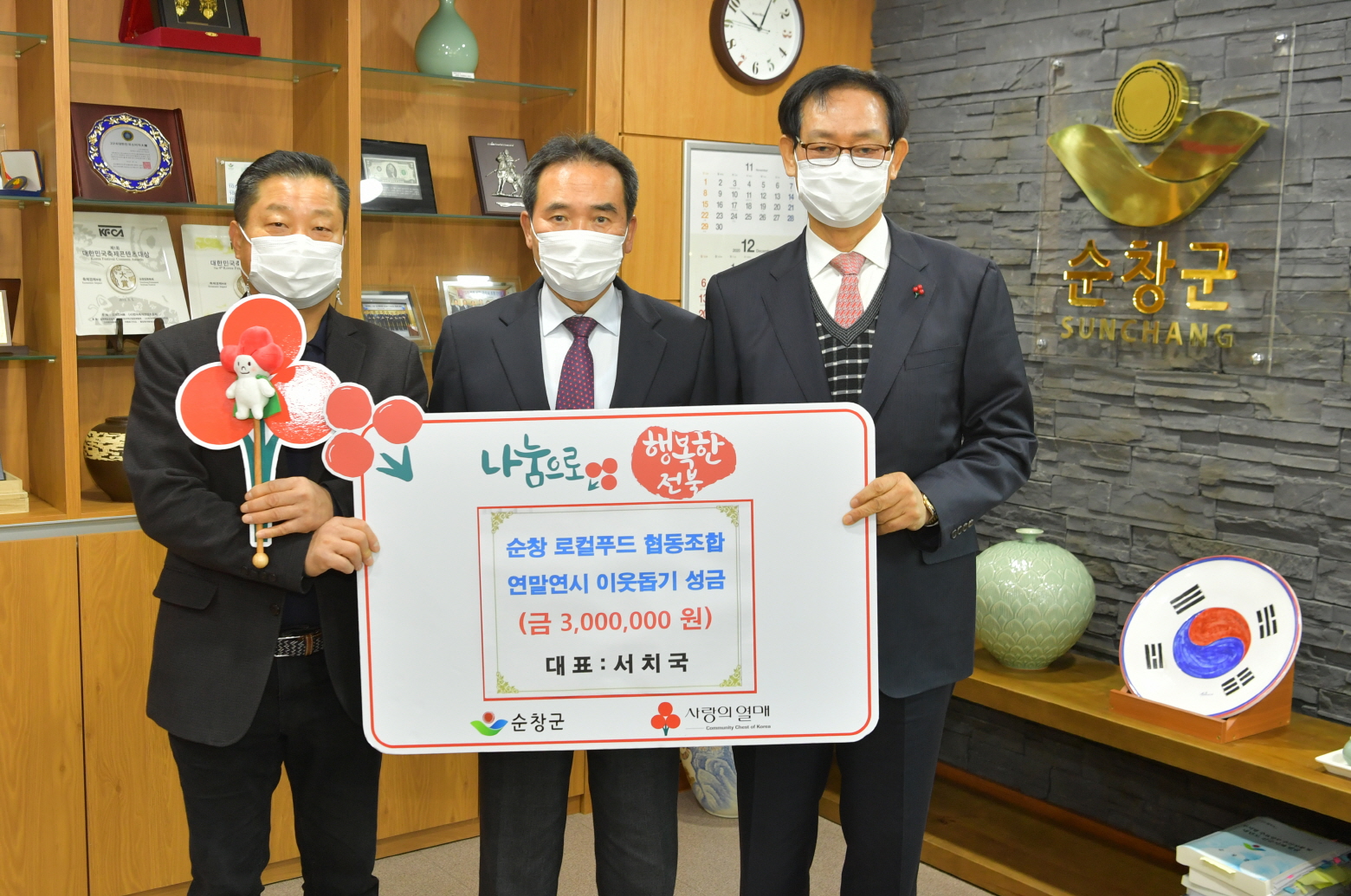 - 순창로컬푸드협동조합(대표 서치국)이 8일 불우이웃과 저소득층을 위해 써달라며 성금 3백만원을 기탁했다. 순창군 농특산물 직판장은 지난 2013년 10월 처음 개장하여 2016년 8월부터 순창로컬푸드협동조합에서 위탁운영을 하고 있으며 출하자 조직 428농가, 조합원 160명과 함께 운영하고 있다. 운영 초기에는 참여농가 부족, 농산물 종류가 다양하지 못하는 등 어려움이 많았으나 현재는 매출액이 증가하는 추세다. 올해는 11월말 기준 판매건수 101,679건, 매출액 7억 9200만원을 기록했다. -2020년 12월 08일-