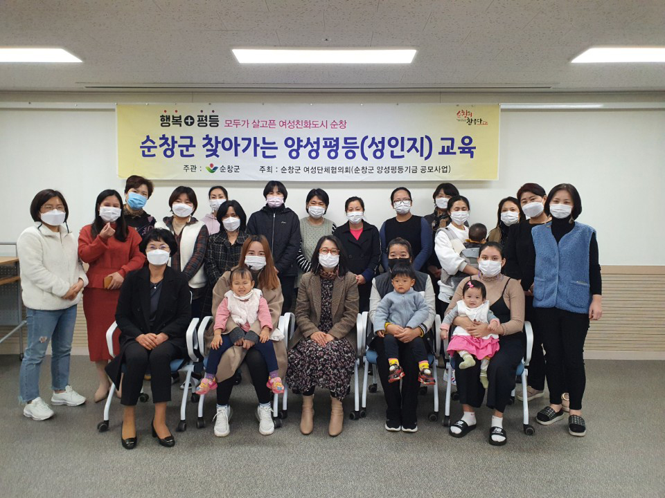 - 순창군 여성단체협의회(회장 지미라)는 25일 순창군 행복누리센터 내 건강가정․다문화가족지원센터 직원 및 결혼이주여성 등을 대상으로 찾아가는 양성평등교육을 실시했다. 순창군 양성평등기금 공모사업의 일환으로 추진했던 이번 교육은, 이미 지난 5일과 19일 각각 복흥면 여성지도자와 순창군 내 여성단체 임원진 등을 대상으로 두 차례 찾아가는 양성평등교육을 실시했다. -2020년 11월 25일-
