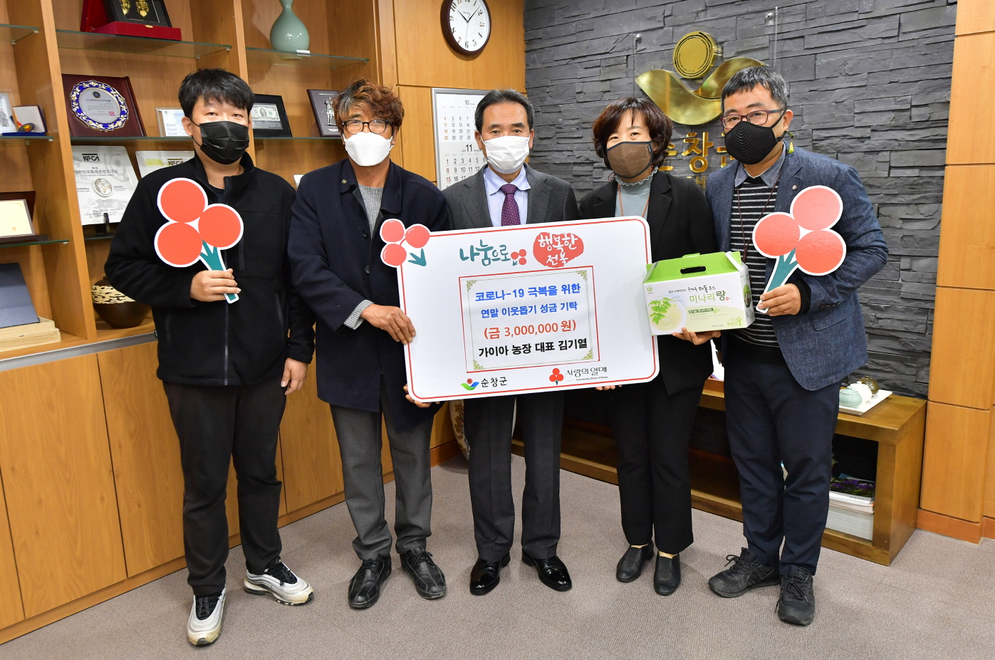 - 순창군 풍산면에 위치한 가이아농장 김기열 대표가 20일 재해펀딩을 통해 벌어들인 수익금 일부를 불우이웃돕기 성금으로 전달해 훈훈함을 전했다. 지난 8월 농장 전체가 침수되어 큰 재산피해를 입은 가이아농장에게 순창군농업기술센터는 재해펀딩을 제안해 실현시켰다. 지난 9월 7일부터 10월까지 실시한 펀딩으로 3,000건의 매출이 발생하는 성과를 거두고 재해펀딩으로 판매한 상품을 건당 1,000원씩 적립해 총 300만원을 순창군 불우이웃을 돕는 성금으로 기부했다. -2020년 11월 20일-