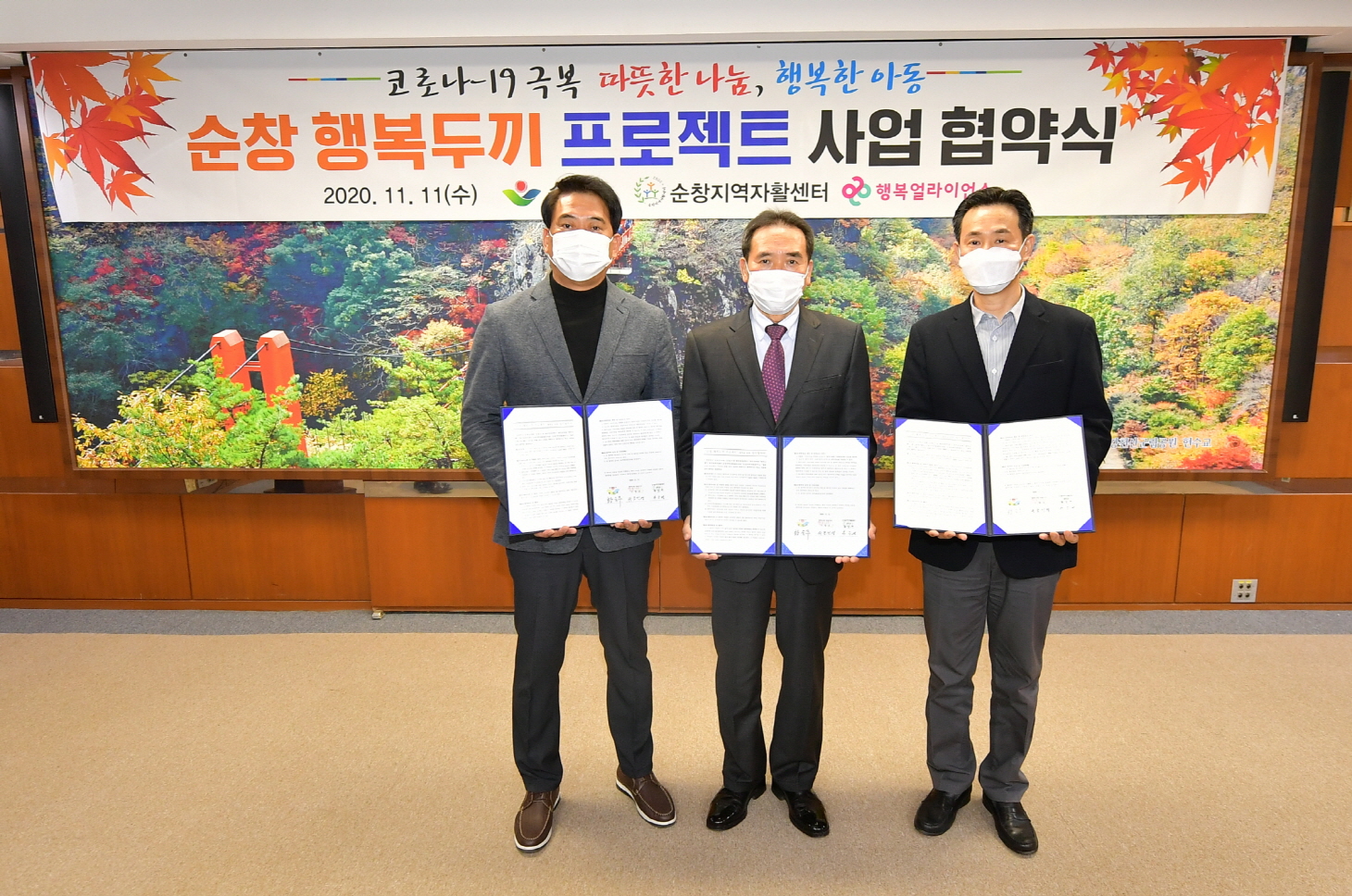 - 11일 군청 2층 영상회의실에서 행복얼라이언스와 순창지역자활센터 등과 함께 도움이 필요한 아동을 발굴하고, 지속적인 지원을 위한 사회안전망을 구축하는 ‘순창 행복두끼 프로젝트’ 협력을 위한 업무협약을 체결했다. ‘행복두끼 프로젝트’는 행복얼라이언스가 100여개의 멤버사가 기부한 자원으로 복지사각지대 아동을 먼저 지원하고, 이후 대상 아동을 지자체가 아동급식제도로 편입하고 예산를 확보해 지속적으로 지원하는 프로젝트다. -2020년 11월 11일-