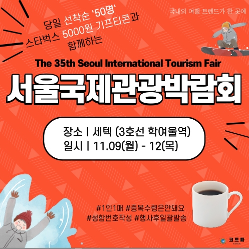- 순창군이 전라북도와 함께 12일 서울 대치동 세텍(SETEC)에서 열린 ‘2020 서울국제관광박람회’에서 관광지 홍보에 열을 올렸다. ‘2020 서울국제관광박람회’는 ㈜코스파가 주최하고, 서울특별시 주관으로 열린 이번 박람회는 지난 9일부터 4일간 열렸으며, 전체 560여개 부스가 차려지며 관광사업 홍보 각축장이 됐다. 순창군 문화관광 홈페이지(http://www.sunchang.go.kr/tour/index.sunchang) -2020년 11월 12일-